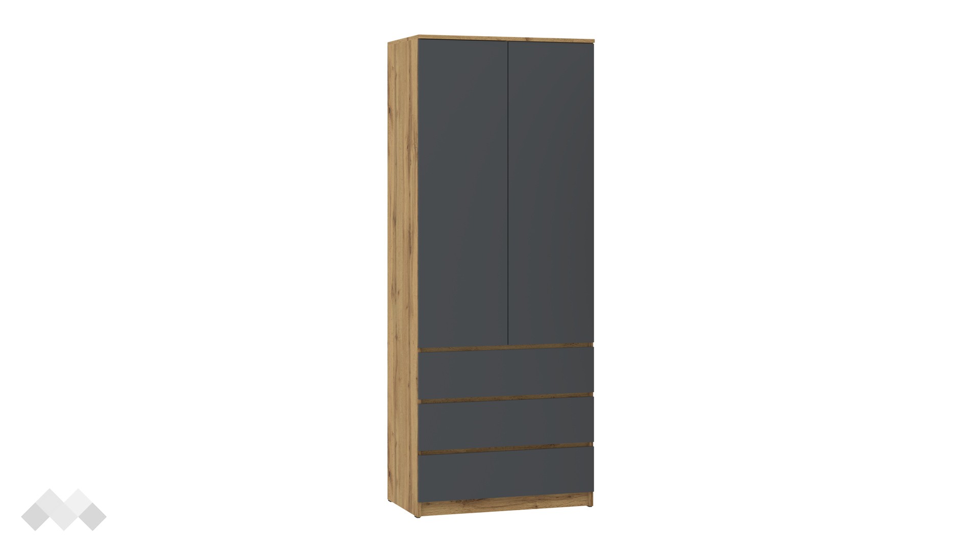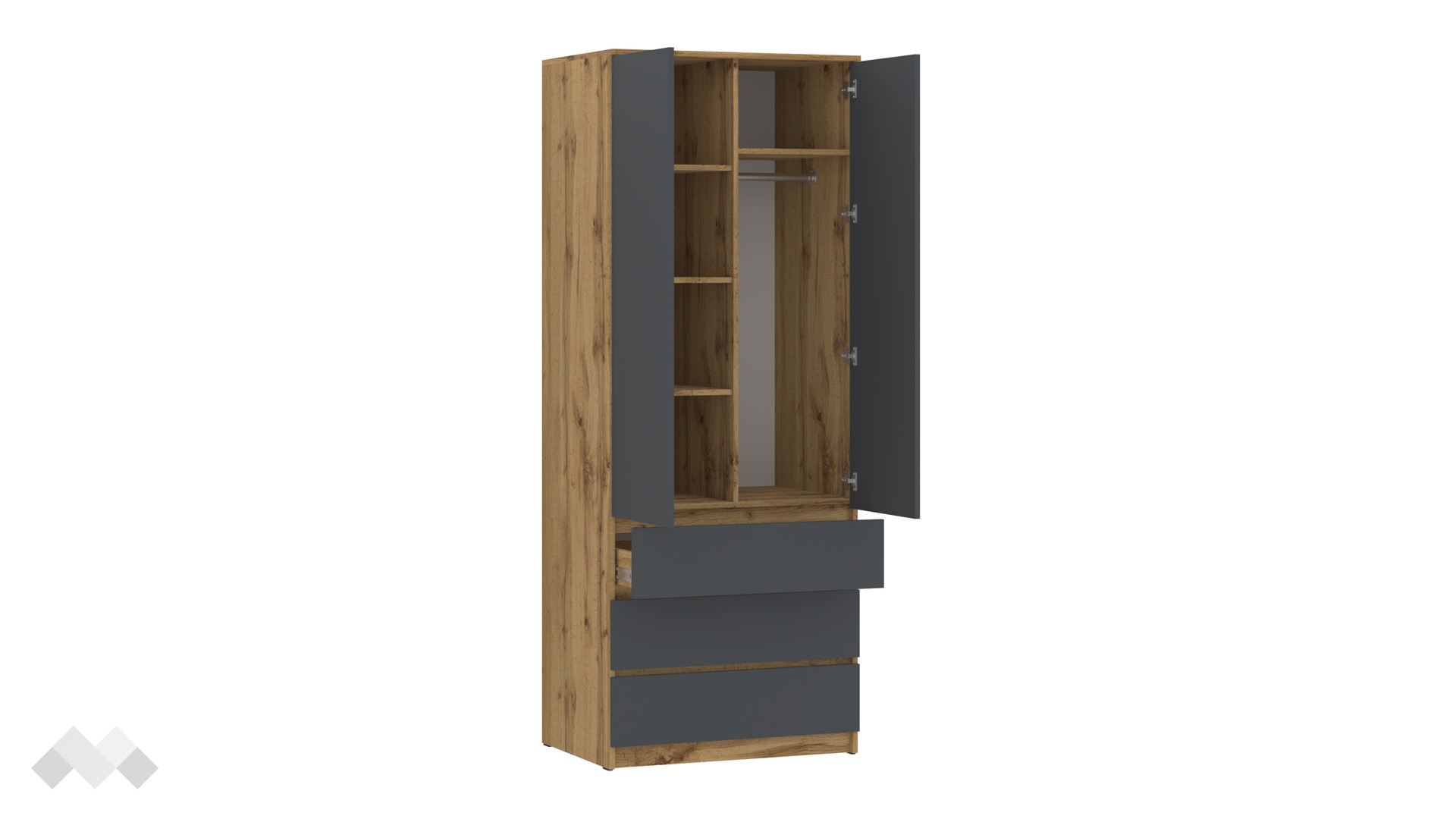 Зад вратите на модела ще намериш широко пространство, четири рафта и лост за закачалки, където да съхраняваш ризи, сака или по-обемни дрехи като палта. В долната си част гардеробът изненадва с нестандартно решение от три чекмеджета, където можеш да организираш бельо или други вещи. Още едно предимство на гардероб Никола са телескопичните водачи на чекмеджетата - те са по-здрави и издържливи във времето.