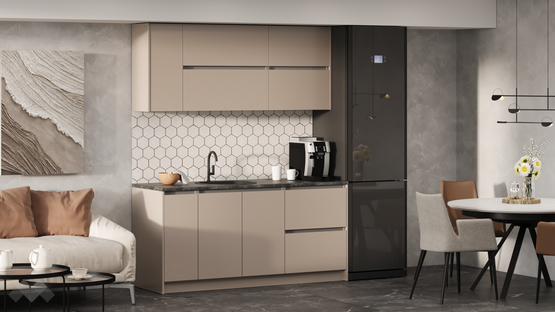Елегантната комбинация от кашмир със сиво и плот в декор - тъмен бетон,придава изискан характер, а функционалните шкафове и чекмеджета осигуряват достатъчно място за всичко необходимо.