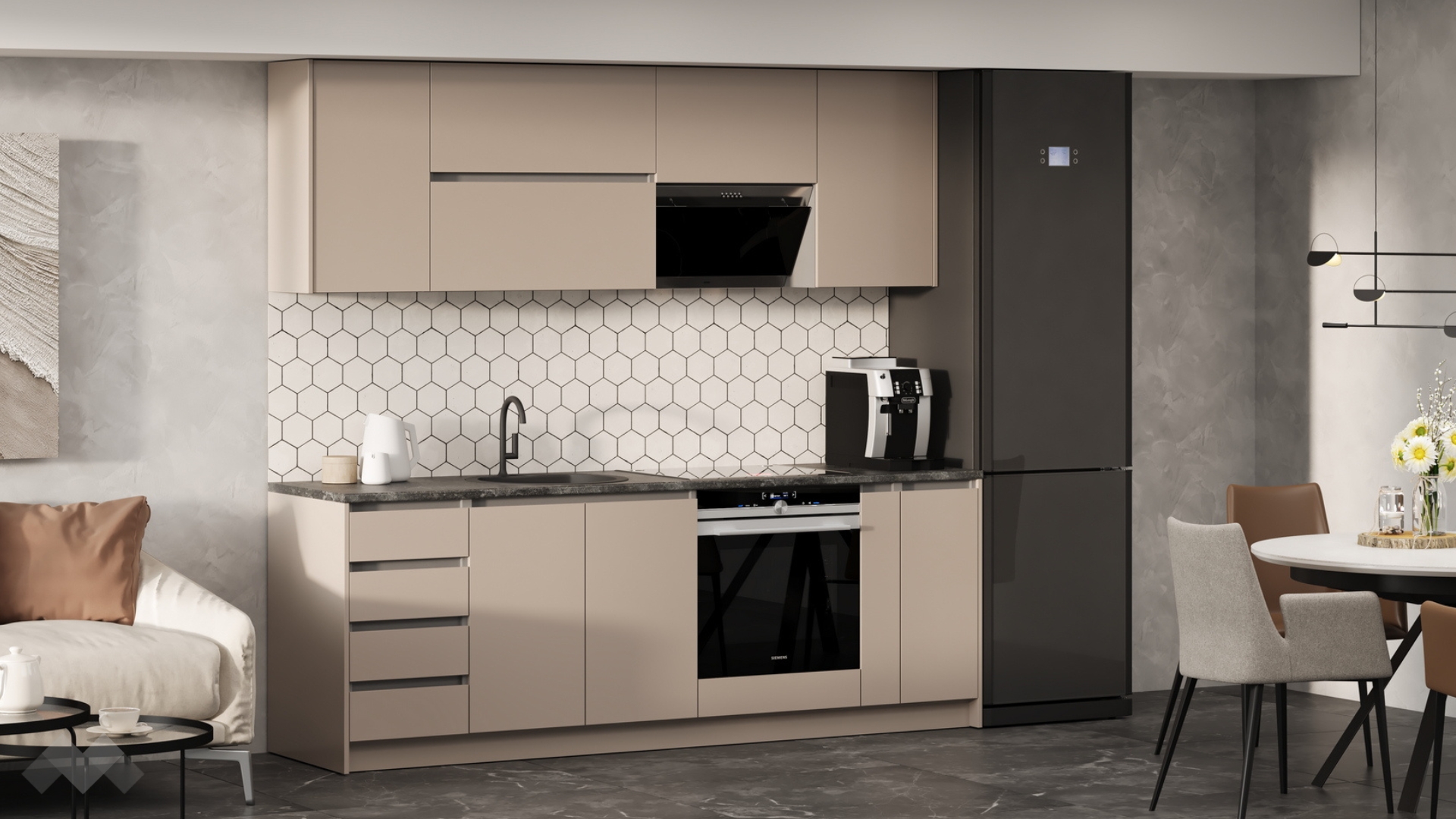 Елегантната комбинация от кашмир със сиво и плот в декор - тъмен бетон,придава изискан характер, а функционалните шкафове и чекмеджета осигуряват достатъчно място за всичко необходимо.