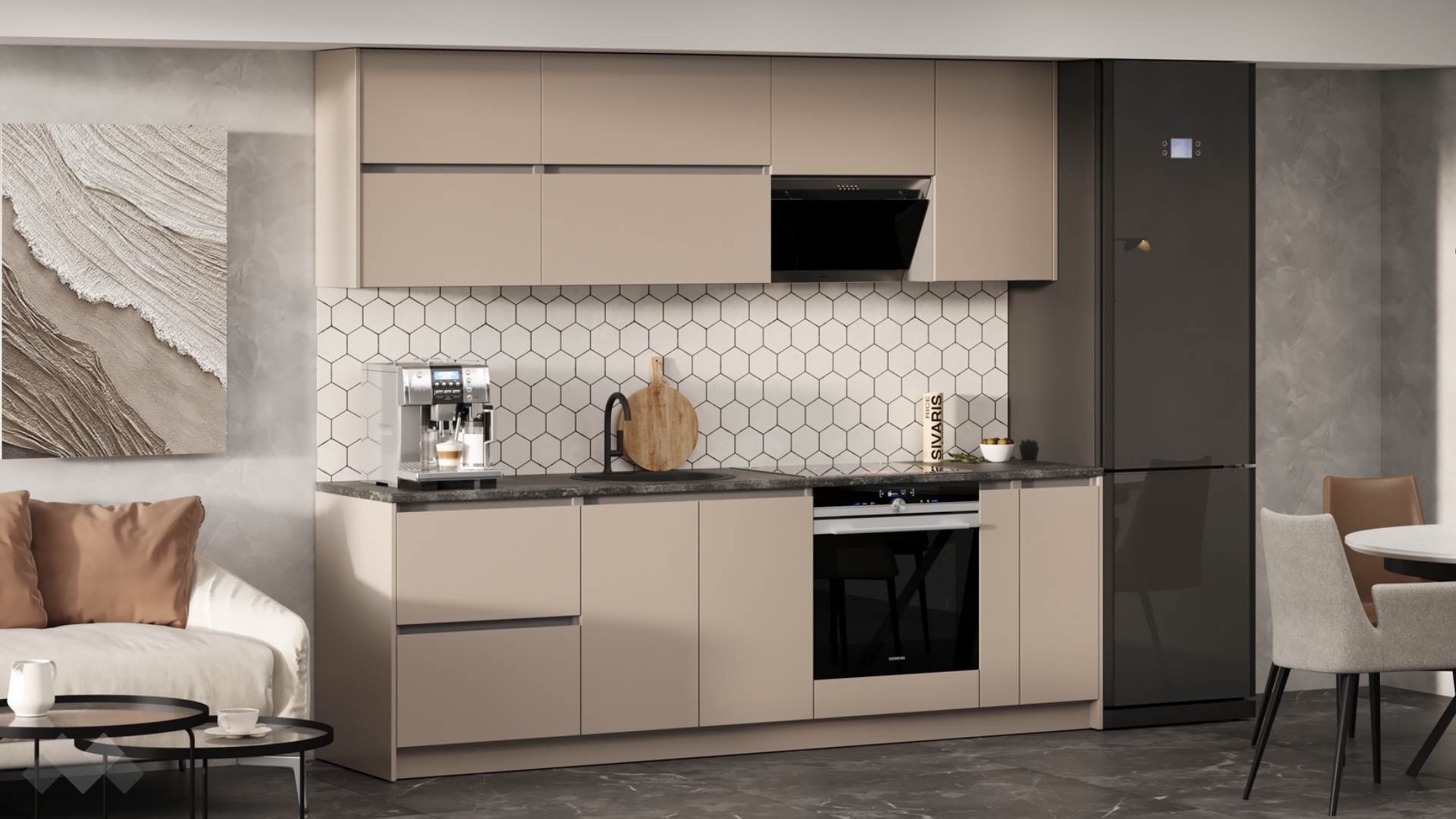 Елегантната комбинация от кашмир със сиво и плот в декор - тъмен бетон,придава изискан характер, а функционалните шкафове и чекмеджета осигуряват достатъчно място за всичко необходимо.
