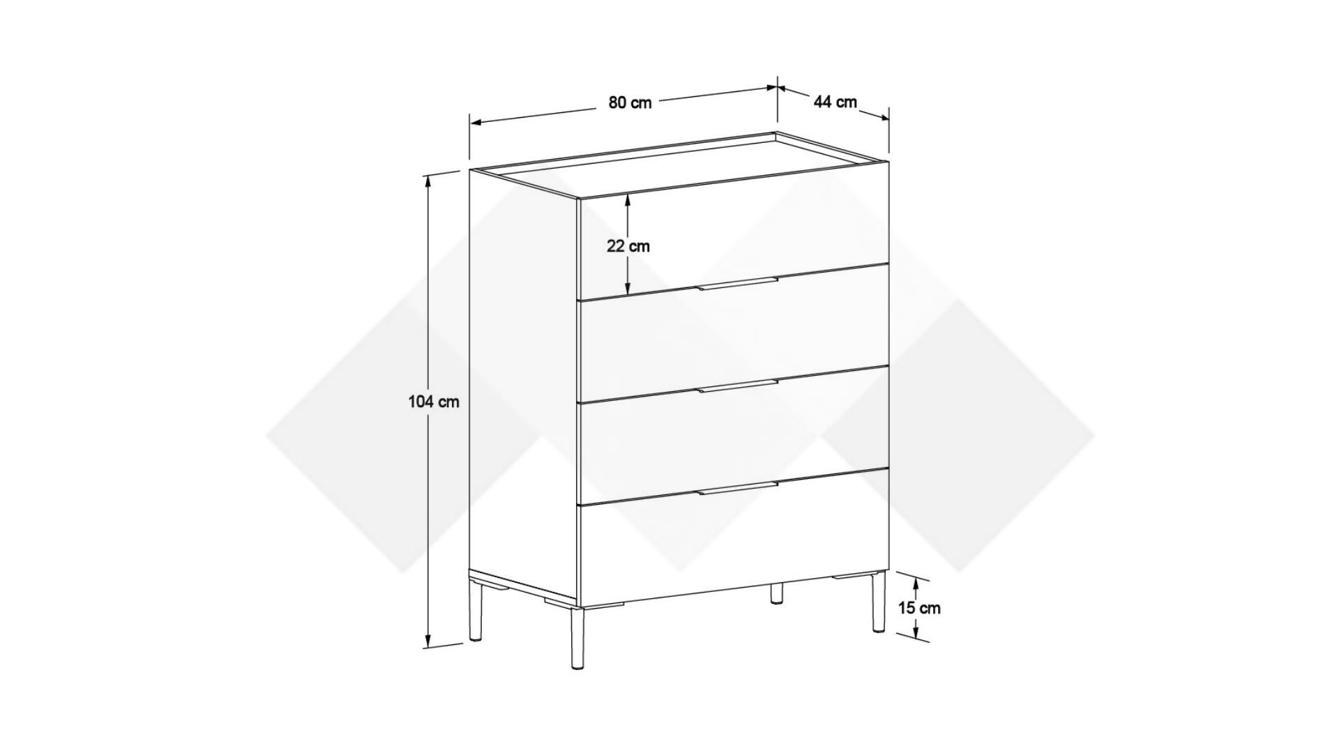 Скринът разполага с четири просторни чекмеджета, които предлагат обширно място за съхранение на бельо, аксесоари или други лични вещи. Чекмеджетата се движат плавно и безшумно, осигурявайки лесен достъп до съдържанието им. Върху него можеш да поставиш красива декорация, любима фотография на цялото семейство или сувенир, за да създадеш още по-уютна и хармонична обстановка у дома. Високите крачета позволяват лесно и удобо почистване.