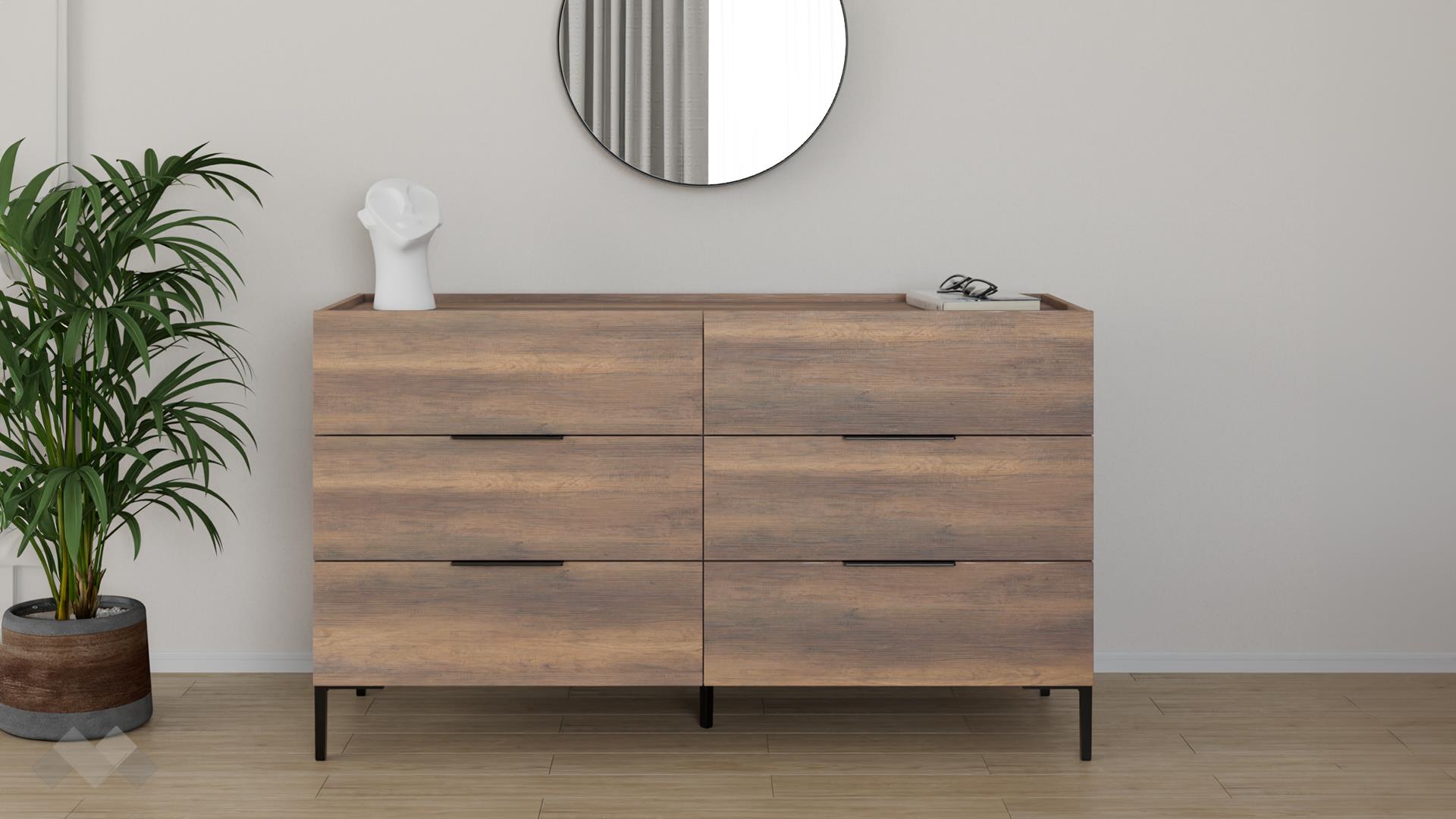 Скринът разполага с шест просторни чекмеджета, които предлагат обширно място за съхранение на бельо, аксесоари или други лични вещи. Чекмеджетата се движат плавно и безшумно, осигурявайки лесен достъп до съдържанието им. Върху него можеш да поставиш красива декорация, любима фотография на цялото семейство или сувенир, за да създадеш още по-уютна и хармонична обстановка у дома. Високите крачета позволяват лесно и удобо почистване.