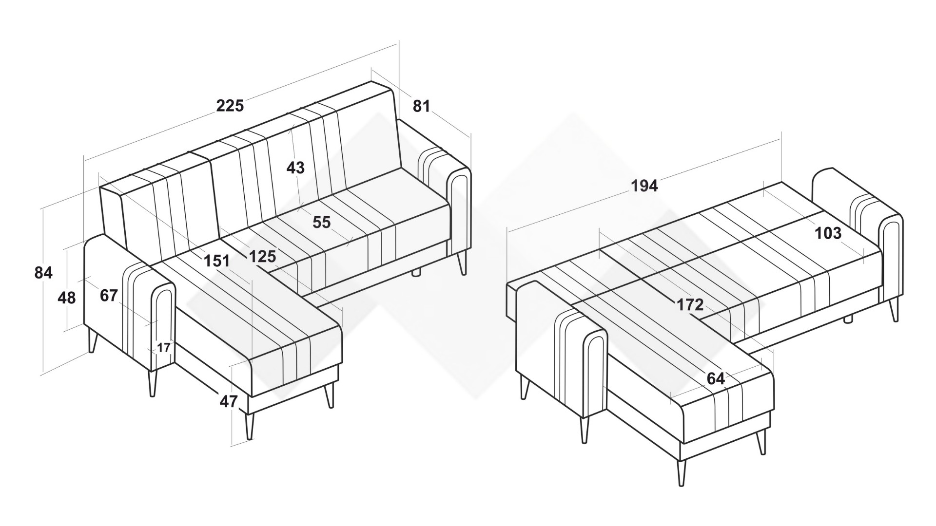 Д: 225 см Ш: 151 см В: 84 см