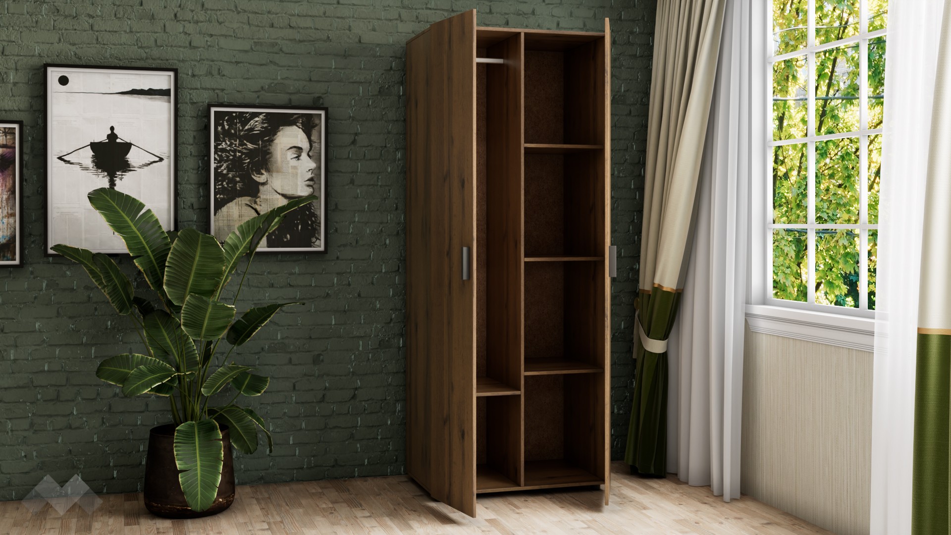Гардероб Оптима ще ви впечатли с неутралния си декор, създаващ усещане за естествени дървесни нишки във винтидж стил. Съчетава се добре както с цветове в сивата, така и с цветове в кафявата гама. Има практично разпределение, което ви позволява да подредите добре всички дрехи и аксесоари. Той е двукрилен, с 4 обемни рафта и лост за закачалки. Можете да използвате рафтовете за съхранение на сгънати дрехи, по-обемни пуловери, завивки или други вещи, а на лоста да закачите всичко, което искате да бъде готово за обличане.