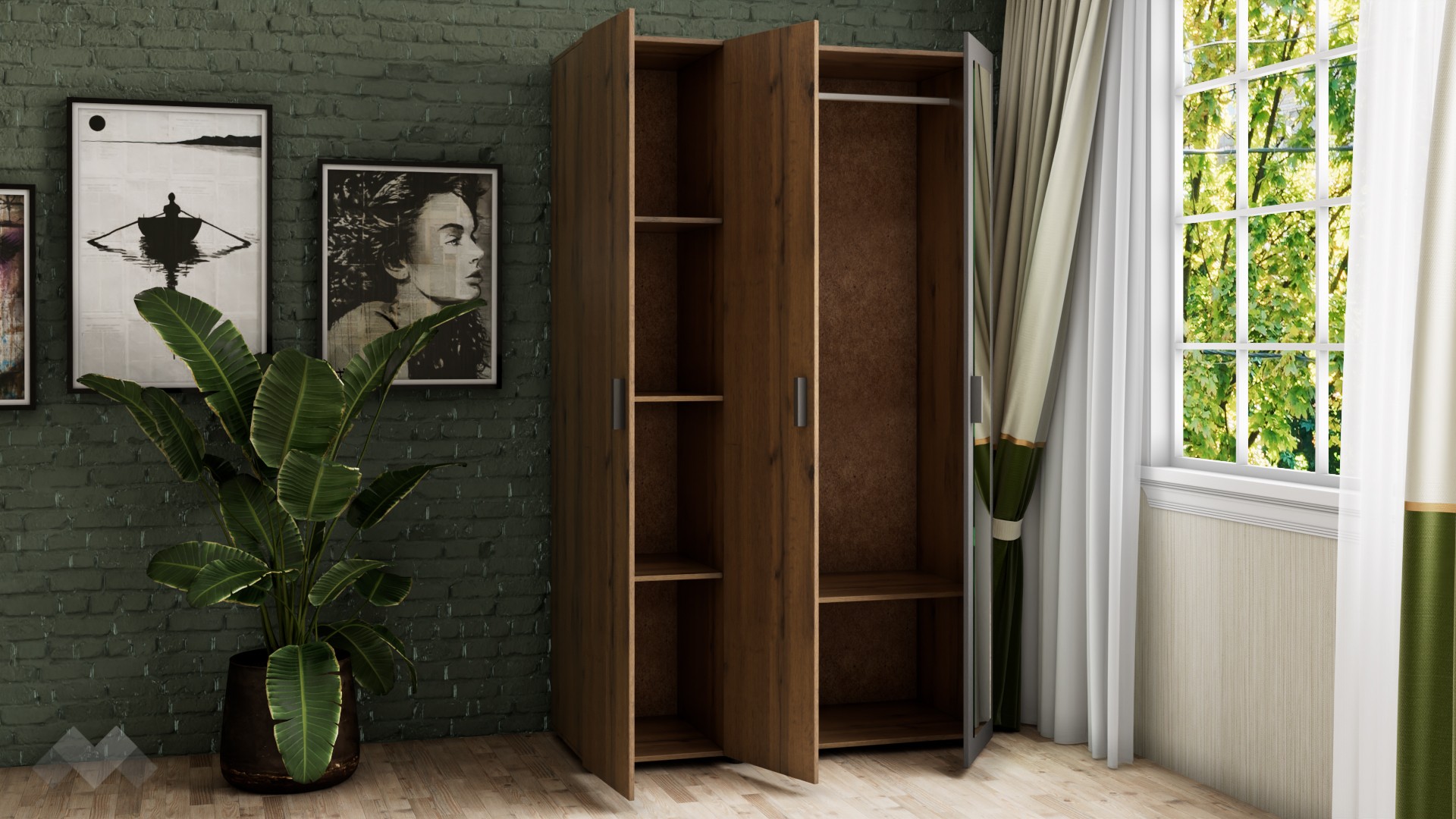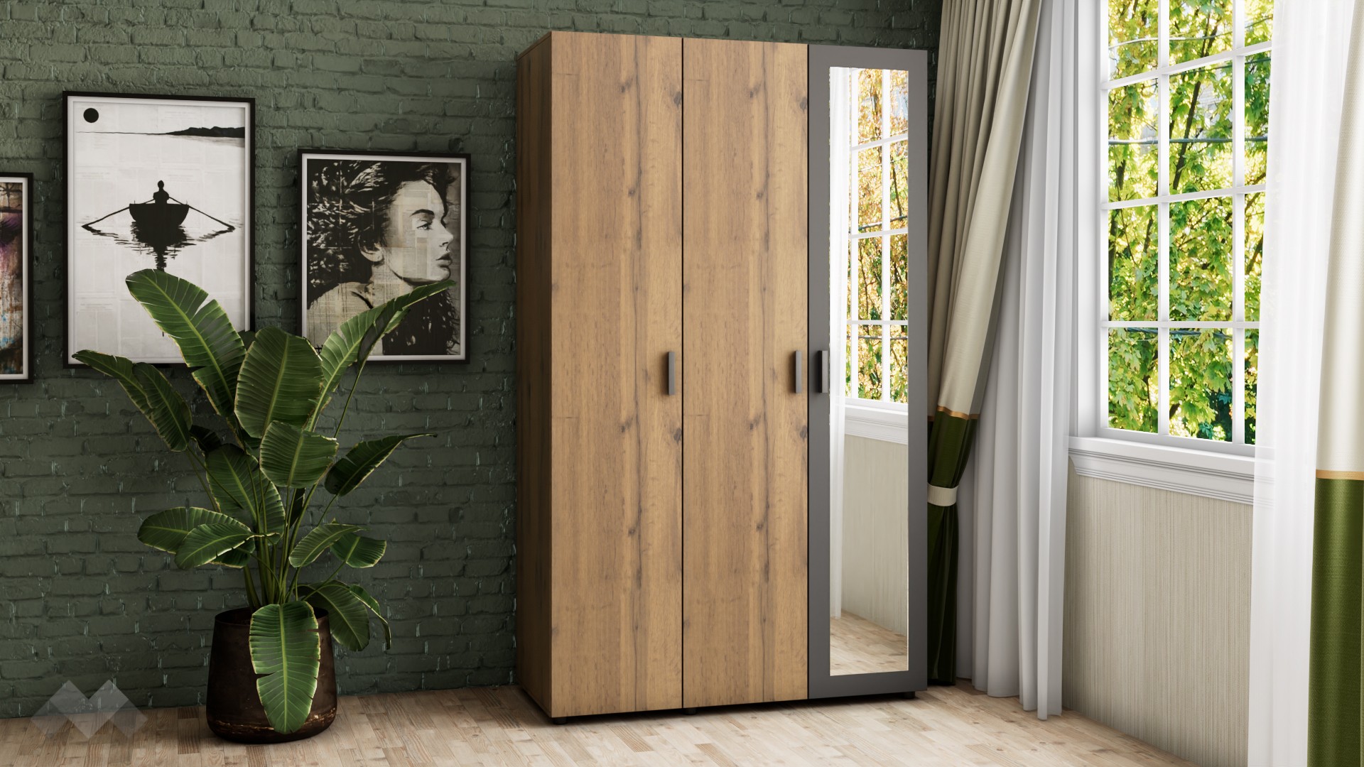 Оптима е практичен трикрилен гардероб с функционално разпределение. Декорът е неутрален, с усещане за естествени дървесни нишки във винтидж стил. Той е трикрилен, с 4 обемни рафта и лост за закачалки. Можеш да използваш рафтовете за съхранение на сгънати дрехи, по-обемни пуловери, завивки или други вещи, а на лоста да закачиш всичко, което искаш да бъде готово за обличане.