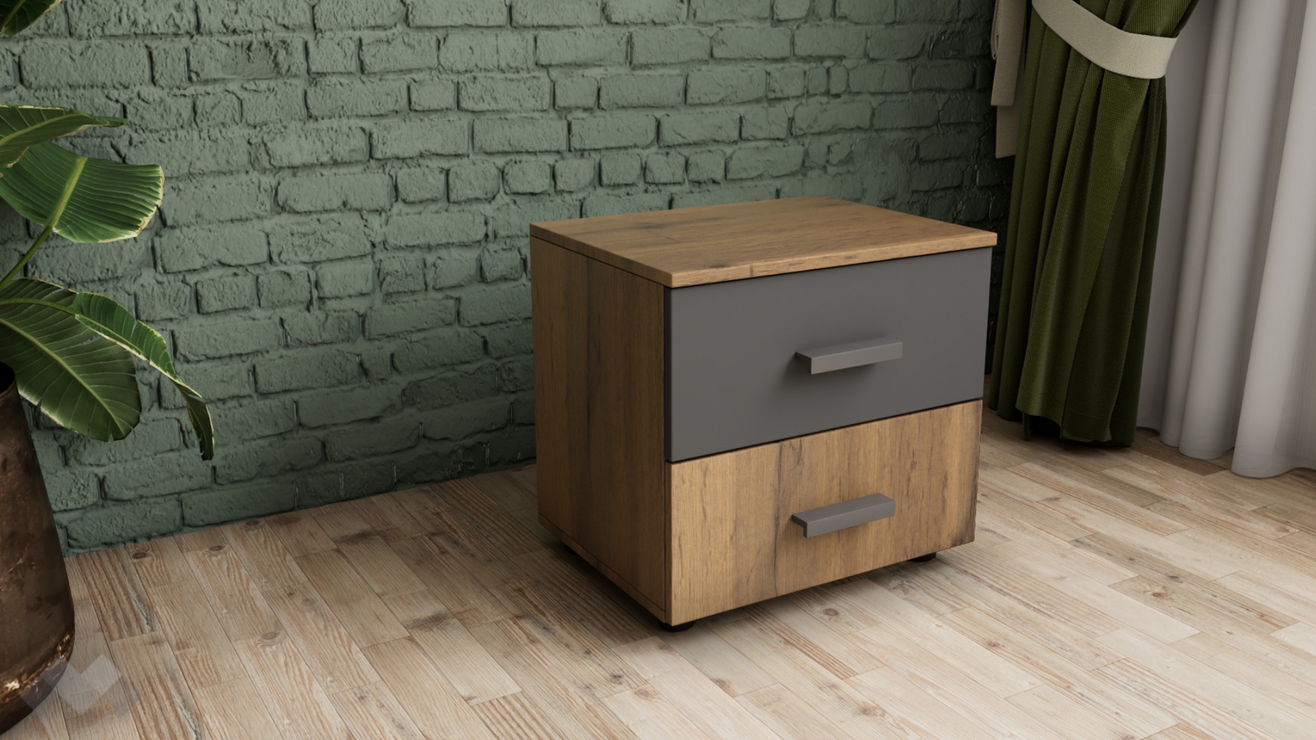 Съчетава се добре както с цветове в сивата, така и с цветове в кафявата гама. Малък, но практичен, с оптимална височина, пасва буквално на всяко легло. Благодарение на двете чекмеджета разполагаш с достатъчно място за организация на всякакви вещи и дреболии. Плотът е разположен по-ниско, за да можеш да използваш и него като рафт.