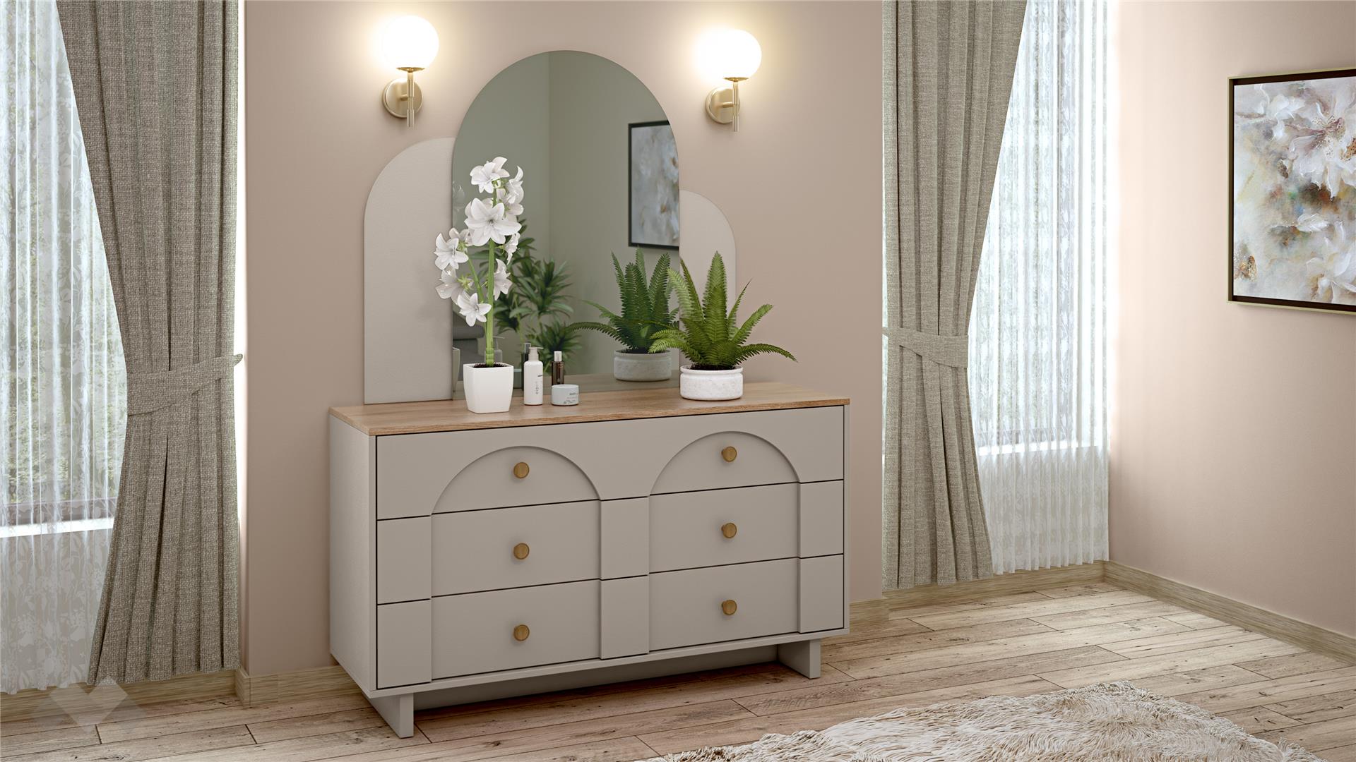 Осигури си уют у дома с бежови и дървесни тонове. Елегантната визия и модерната цветова комбинация създават хармонична и завършена бохемска визия на спалнята. Скрин с огледало Рена впечатлява освен с елегантност и с изключителна функционалнот.