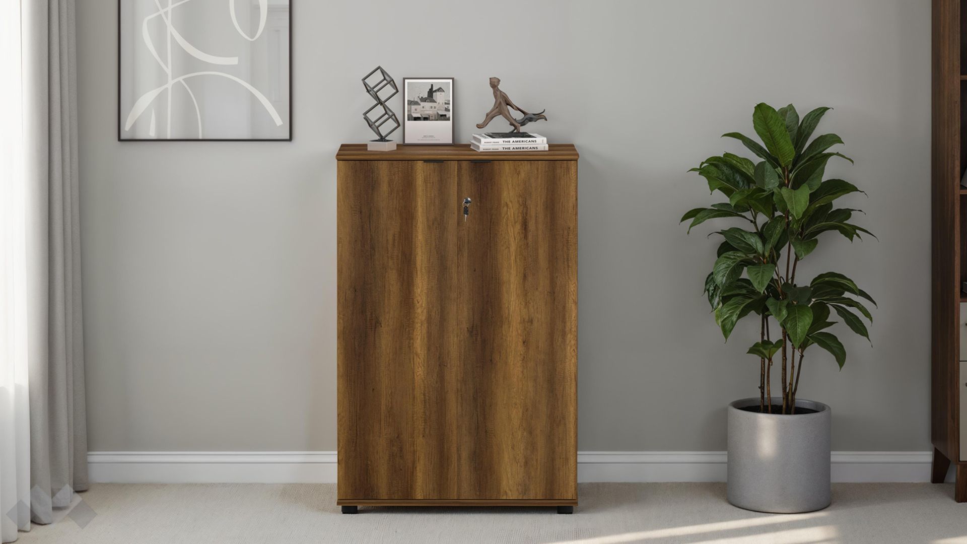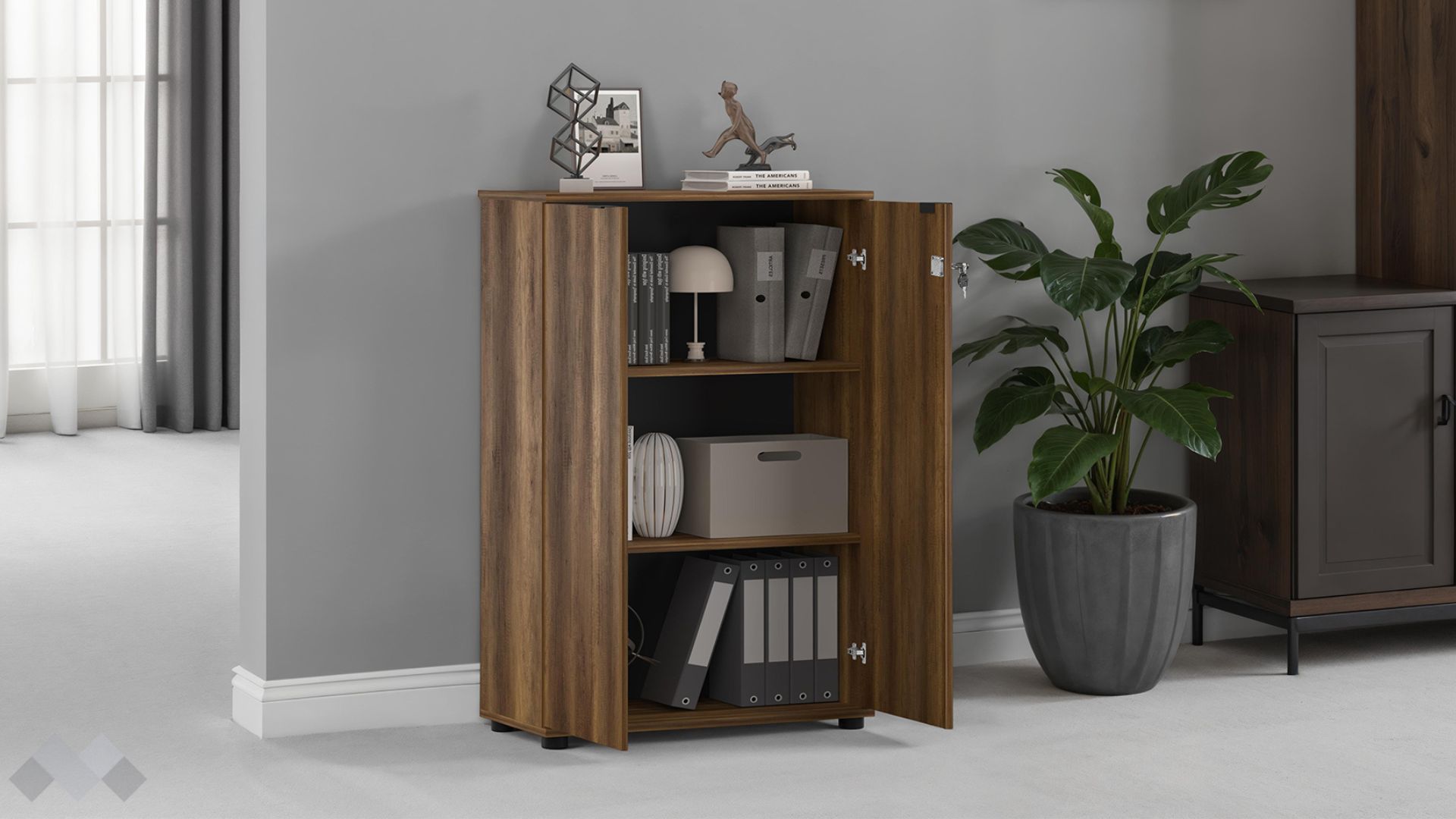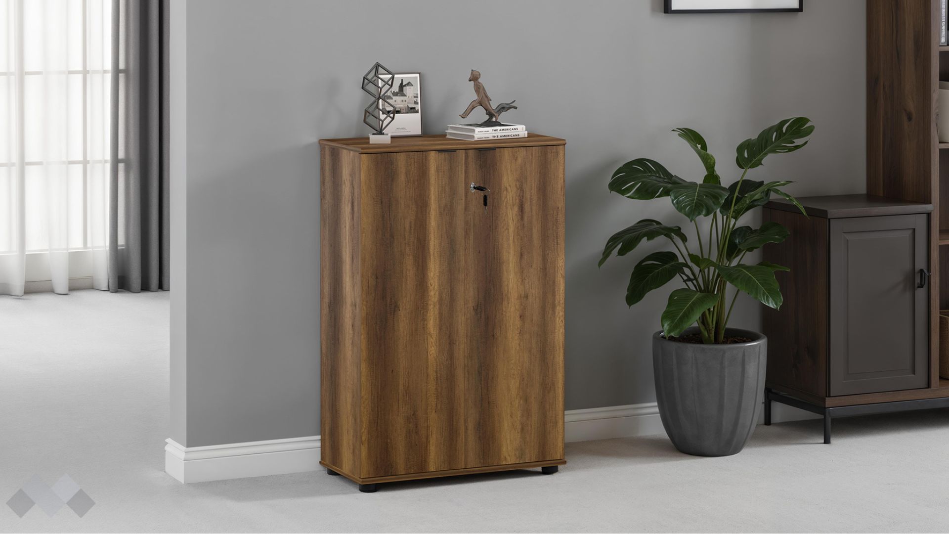 Зад двете врати на скрина са разположени два удобни рафта, които ти позволяват да разделиш пространството и да организираш документи, папки, офис консумативи или лични вещи по твой вкус. Всеки предмет, който съхраняваш, остава защитен благодарение на здравата ключалка.