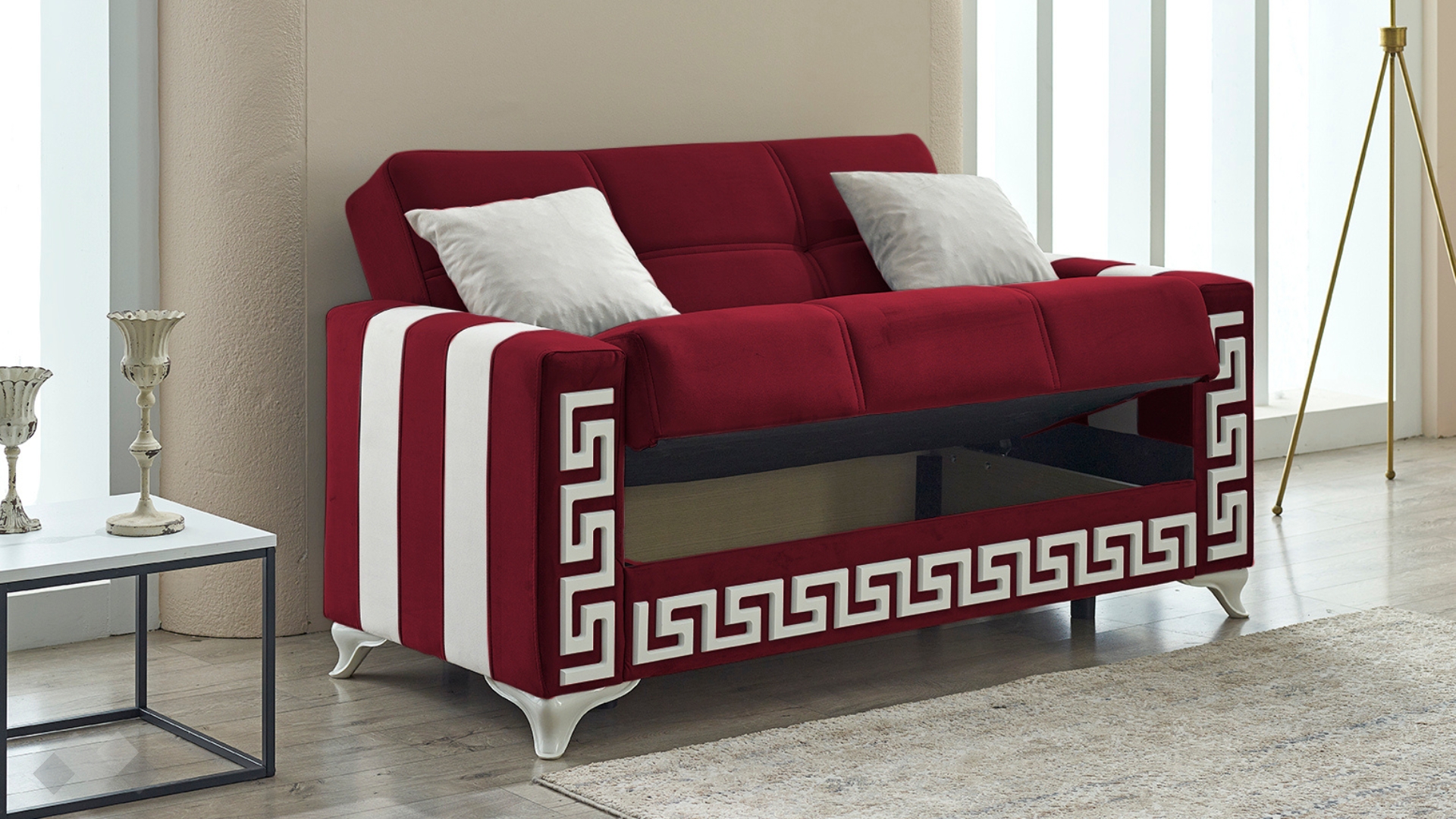 Диван Сабина впечатлява с елегантност и стилна визия. Подлакътниците имат вертикални бели ивици отстрани, които допълват белия декоративен кант на лицевата част на дивана и белите му крака. Комбинацията с фигуралните шевове по дамаската и умело подбрания ѝ цвят го превръщат в истинско интериорно бижу.