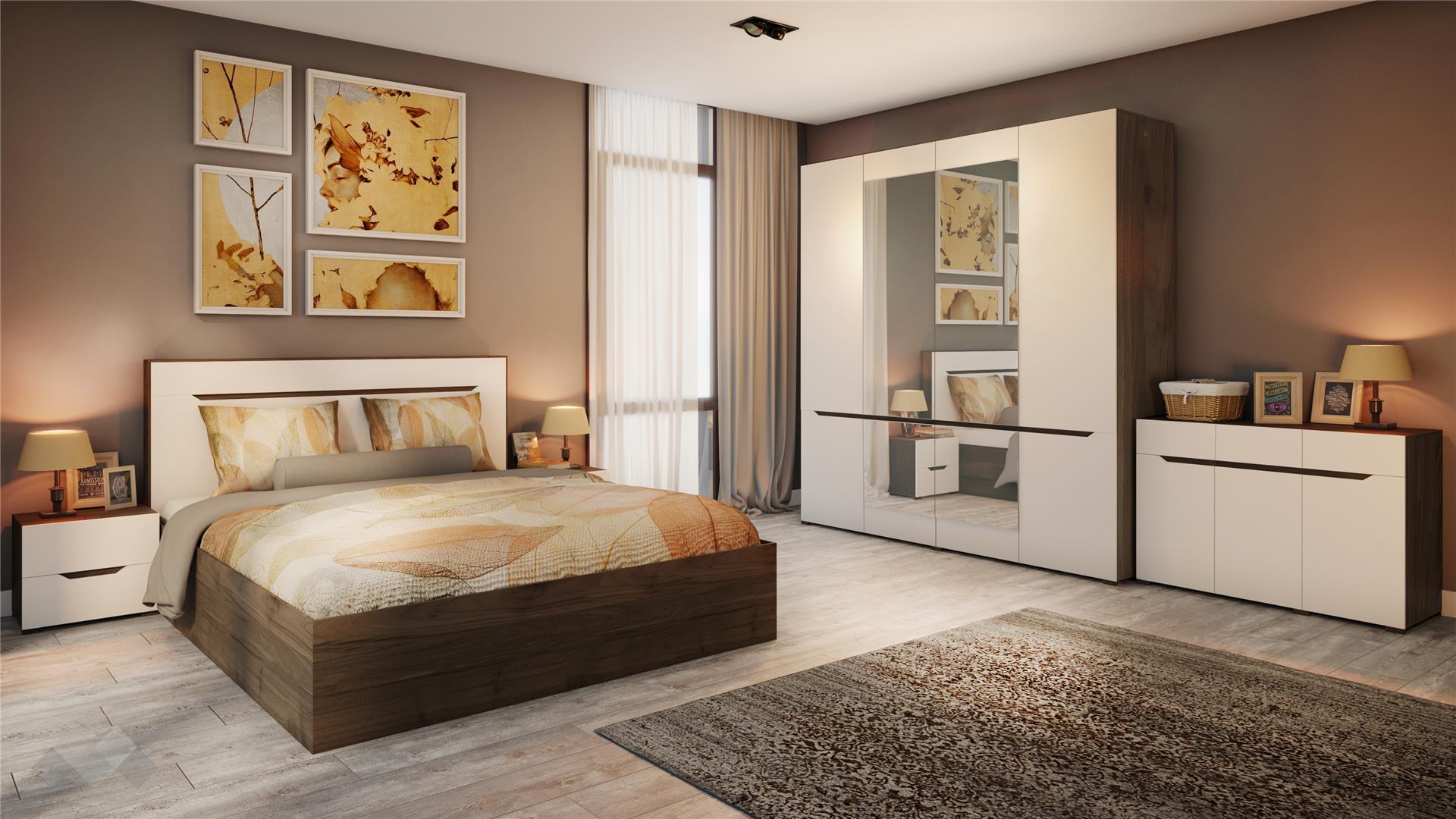 Спалнята е голяма и удобна - за матрак 160/200, с ефектна табла, а допълващите я нощни шкафчета позволяват да ѝ придадеш завършен вид с поставянето на нощни лампи или декорации.
