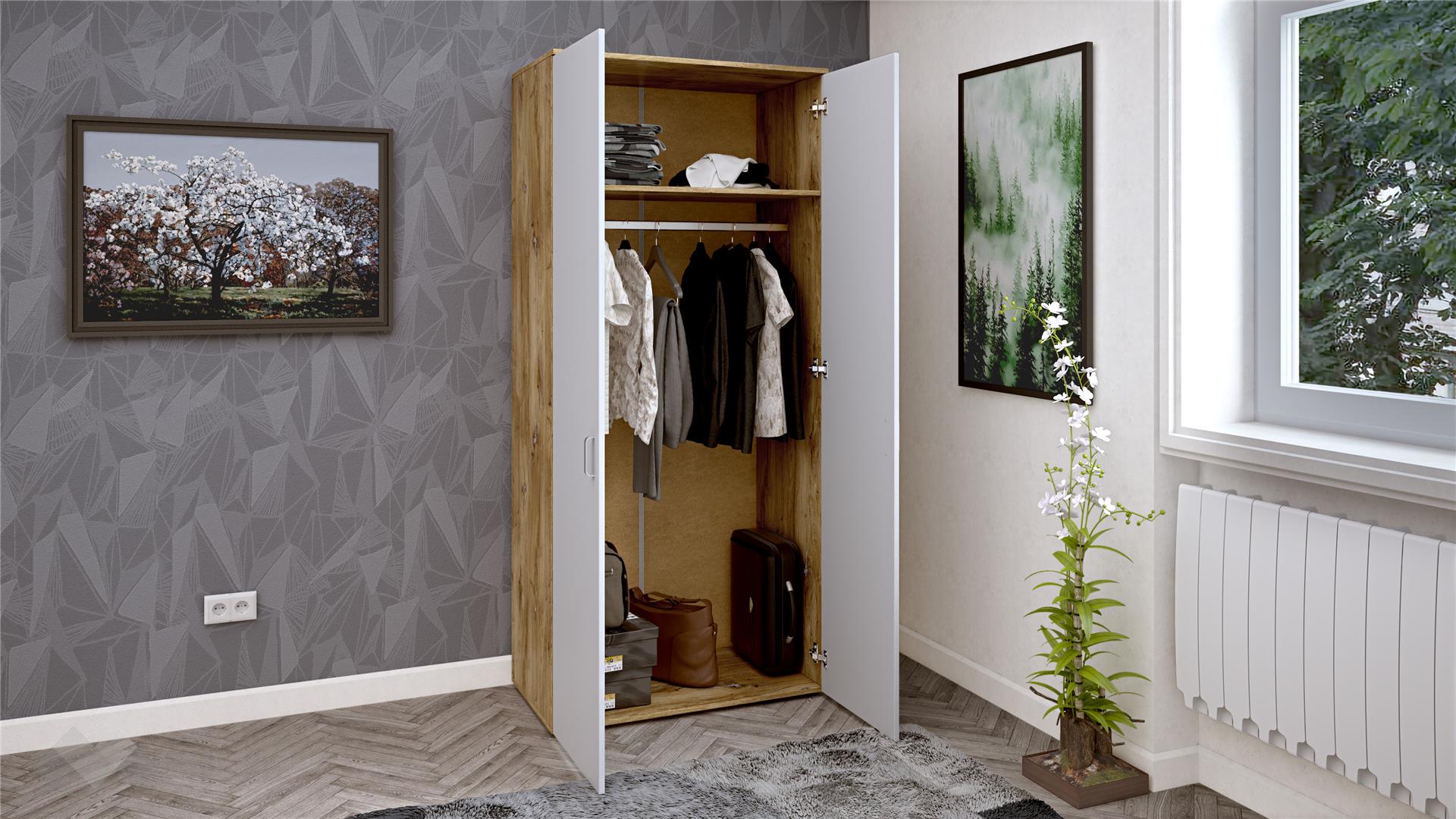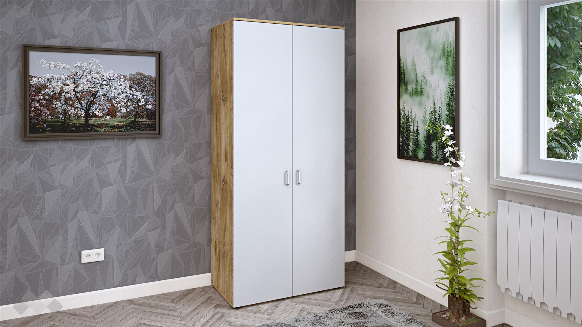 ⭐ Предимства: ✓ 16 мм ПДЧ ✓ двукрилен ✓ рафт ✓ лост за закачалки ✓модерен дизайн ✓ практично разпределение ✓ качествена изработка