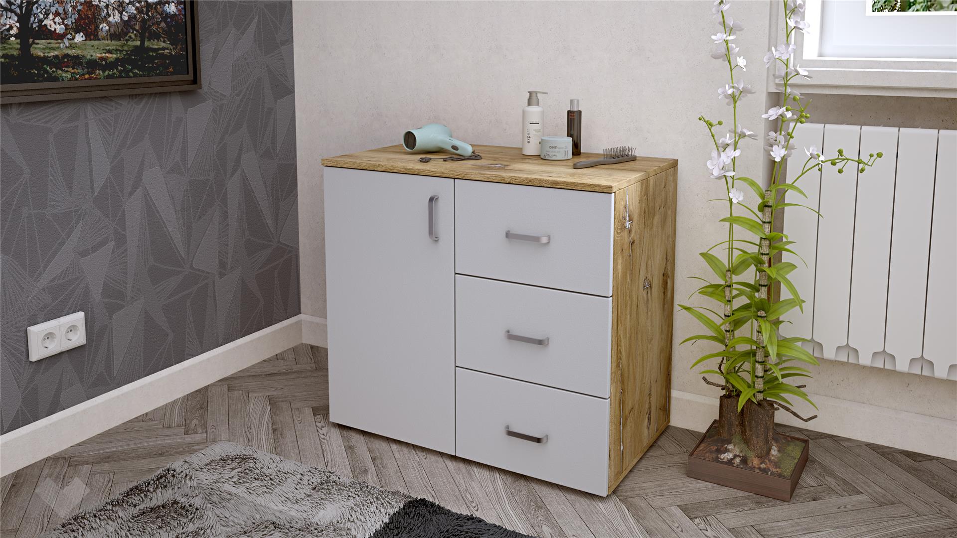 Трите чекмеджета и рафта зад вратата са удобни за подреждане на сгънати дрехи, обувки и кутии за съхранение. Просторния плот ти предоставя място за вещи, които да са ти винаги под ръка.