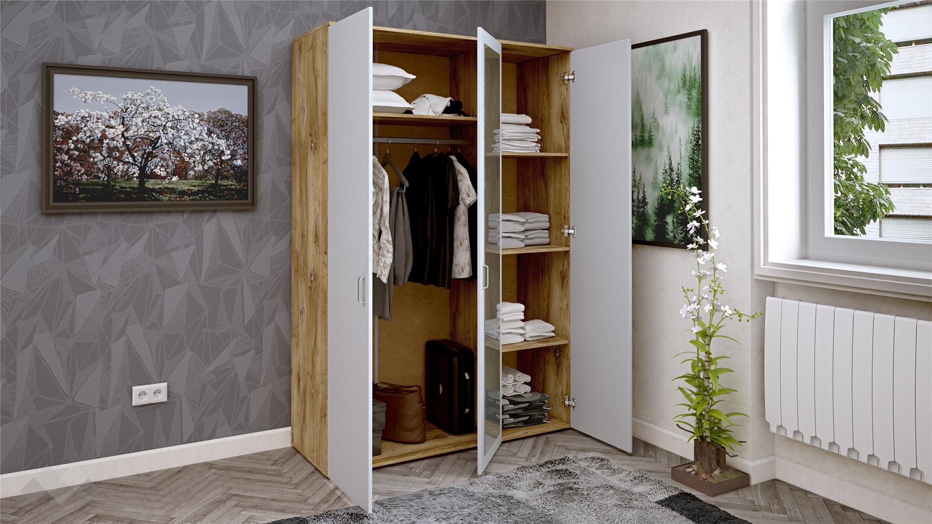 ⭐ Предимства: ✓ 16 мм ПДЧ ✓ трикрилен ✓ 4 рафта ✓ огледало ✓ лост за закачалки ✓модерен дизайн ✓ практично разпределение ✓ качествена изработка