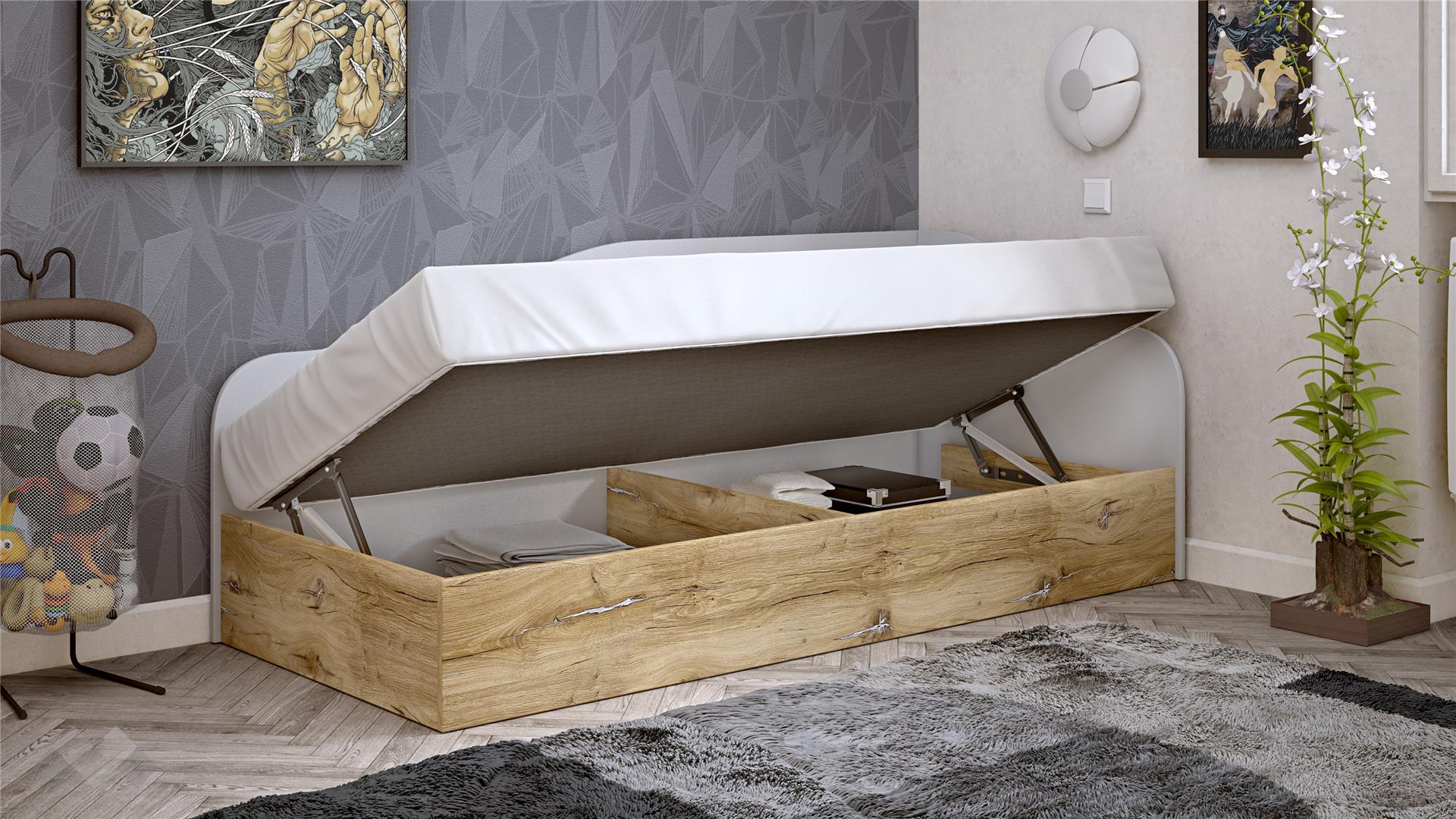 Леглото е проектирано с извита, мека линия на таблата, която едновременно служи като облегалка и предпазва стената. С механизът за повдигане на матрака ти предоставяме изключително ценно допълнително място за съхранение на спално бельо, играчки, дрехи или други вещи, спомагайки за поддържане на реда в стаята.