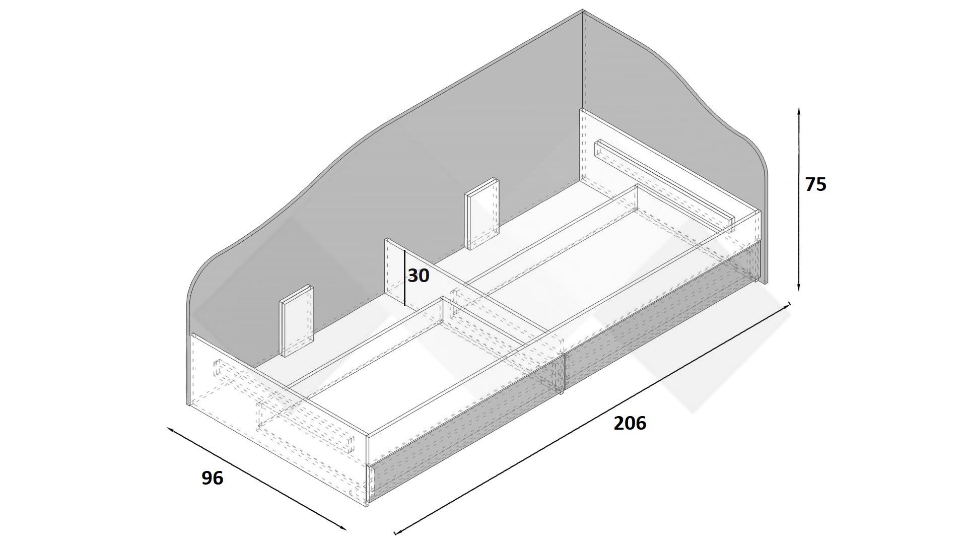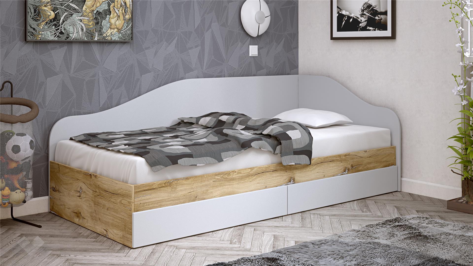 Леглото е проектирано с извита, мека линия на таблата, която едновременно служи като облегалка и предпазва стената. С двете просторни чекмеджета ти предоставяме изключително ценно допълнително място за съхранение на спално бельо, играчки, дрехи или други вещи, спомагайки за поддържане на реда в стаята.