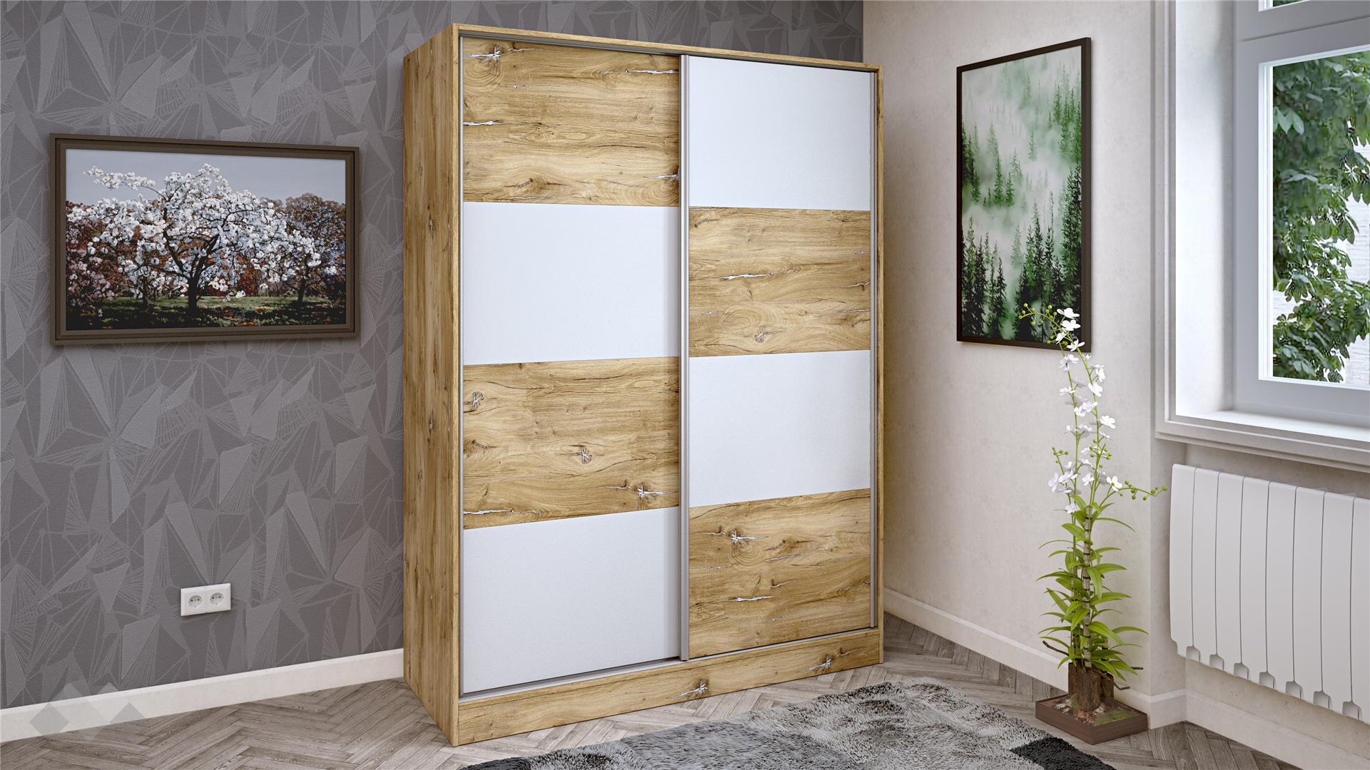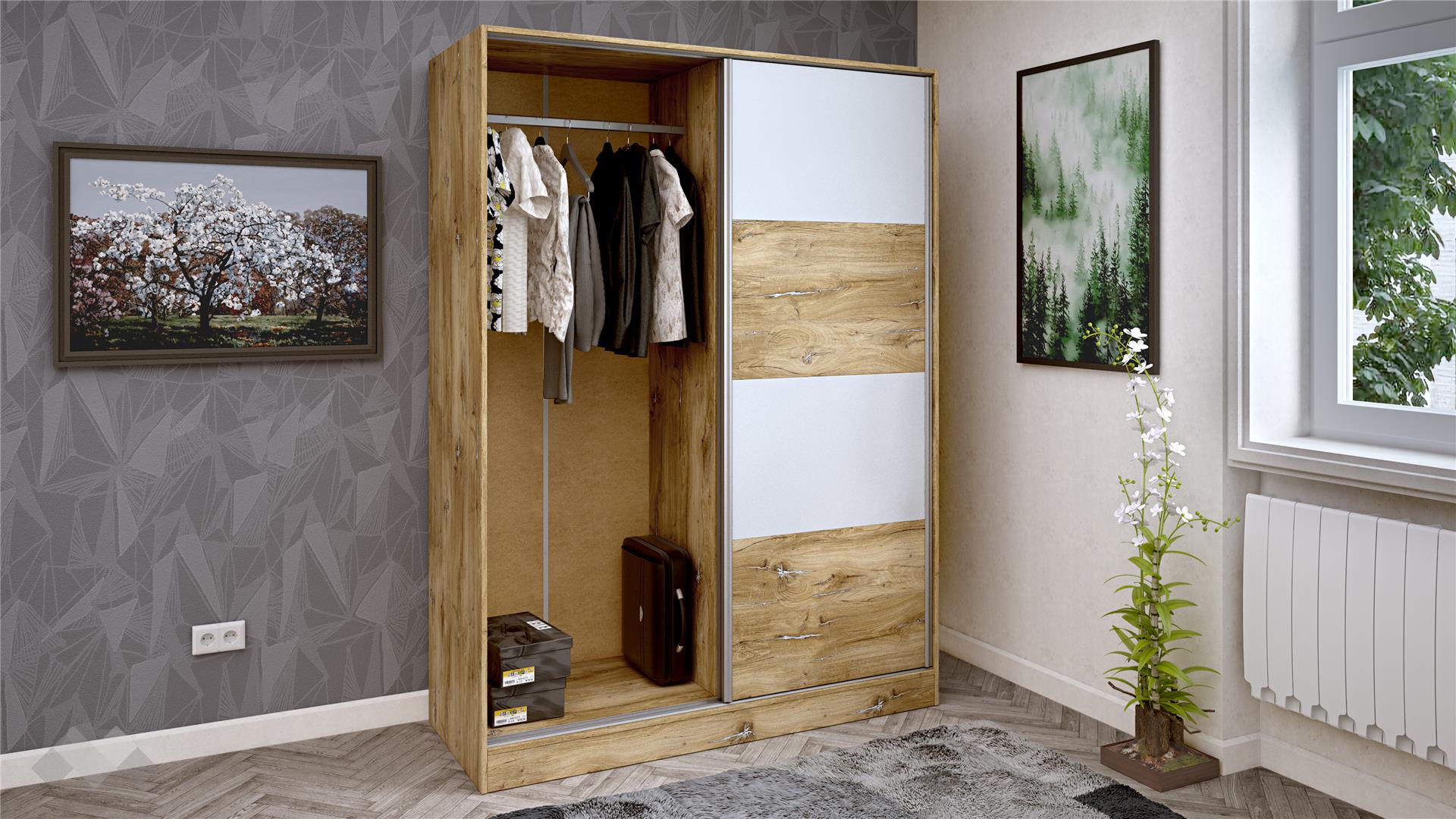 Гардеробът е с компактна форма и ще те впечатли с функционално разпределение, което ще ти позволи да подредиш добре всички дрехи и аксесоари. Лостът за закачалки е подходящо място, където да подредиш палта и по-обемни връхни дрехи или да закачиш всичко, което искаш да бъде готово за обличане, а четирите рафта са удобни за подреждане на сгънати дрехи, обувки и кутии за съхранение.