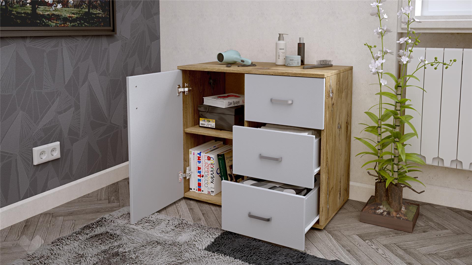 Класическият скрин е с три чекмеджета и рафт зад вратата, които са удобни за подреждане на сгънати дрехи, обувки и кутии за съхранение. Просторния плот ти предоставя място за вещи, които да са ти винаги под ръка.