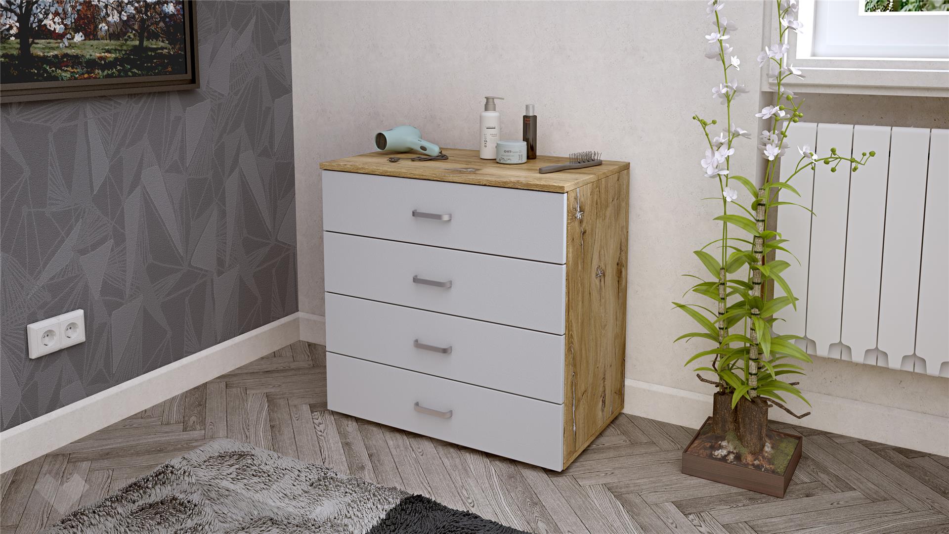 Четирите чекмеджета на скрина са удобни за подреждане на сгънати дрехи, обувки и кутии за съхранение. Просторния плот ти предоставя място за вещи, които да са ти винаги под ръка.