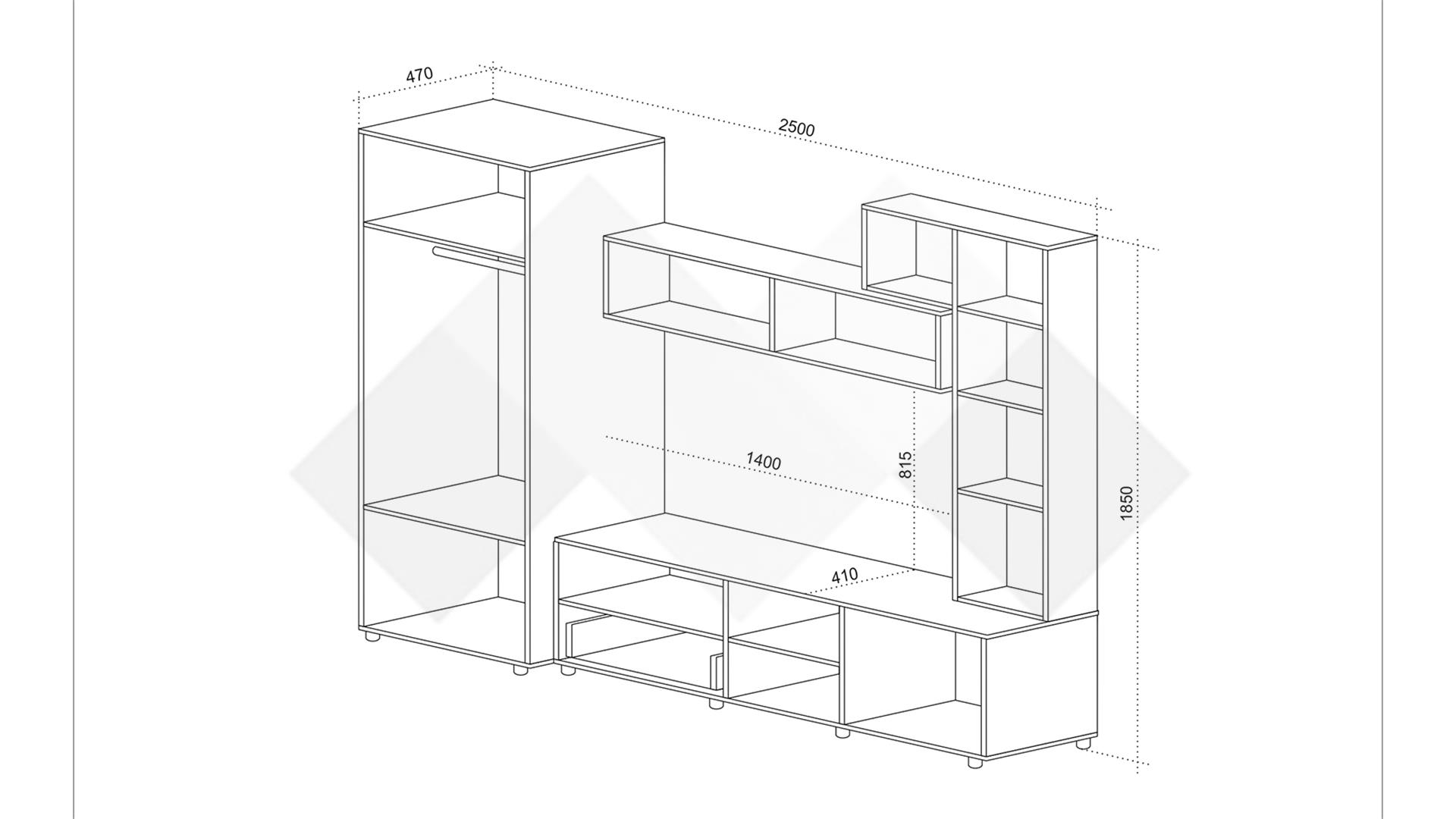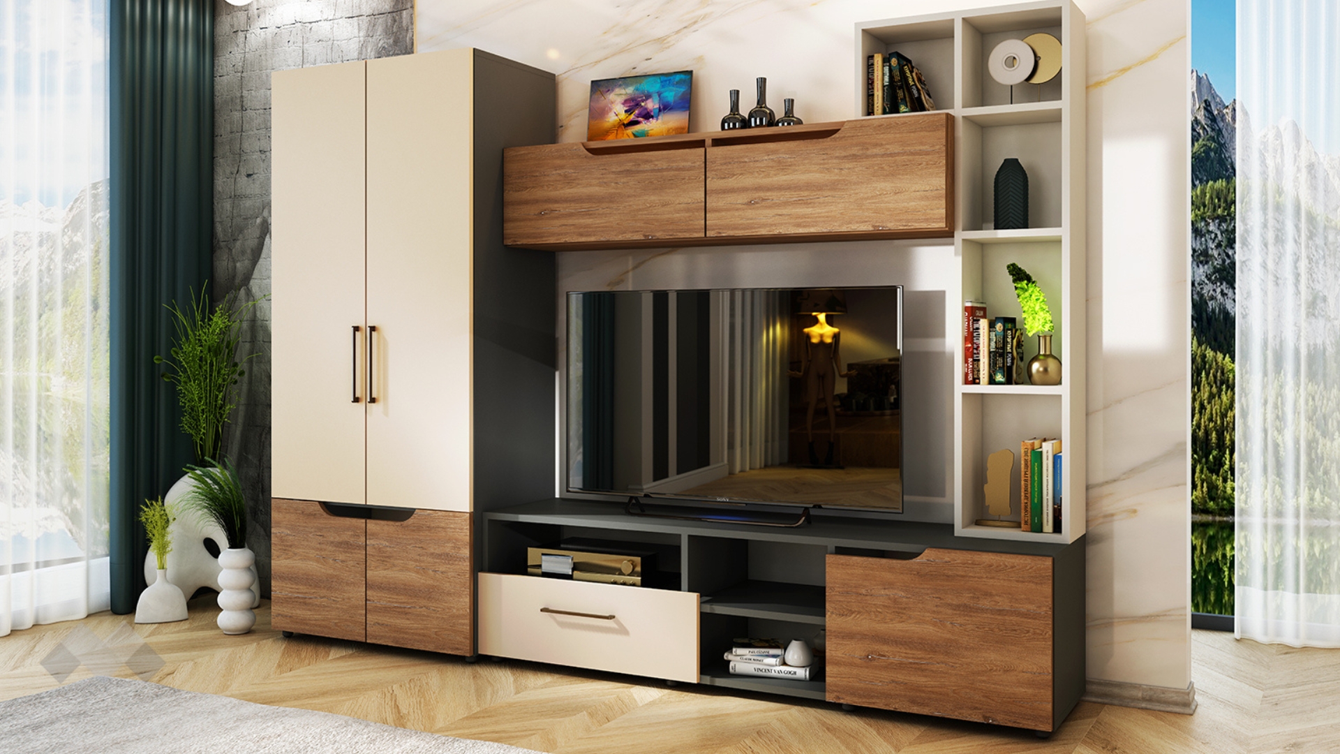 Основата на секцията представлява ТВ шкаф, състоящ се от шкаф с вратичка, отворени ниши, чекмедже и плот. Там можеш да поставиш цялата си съпътстваща техника като ТВ приемници, DVD плейъри или друга техника. Над мястото за телевизор са позиционирани шкафове, където да организираш още полезни за ежедневието вещи. Откритите рафтове са идеални за подреждане на книги, скъпи спомени като фотографии, любими сувенири или други декорации. Двукрилният гардероб разполага с лост за закачалки и два рафта, които ще ти предоставят достатъчно място за дрехи, спално бельо, възглавници и кутии за съхранение.