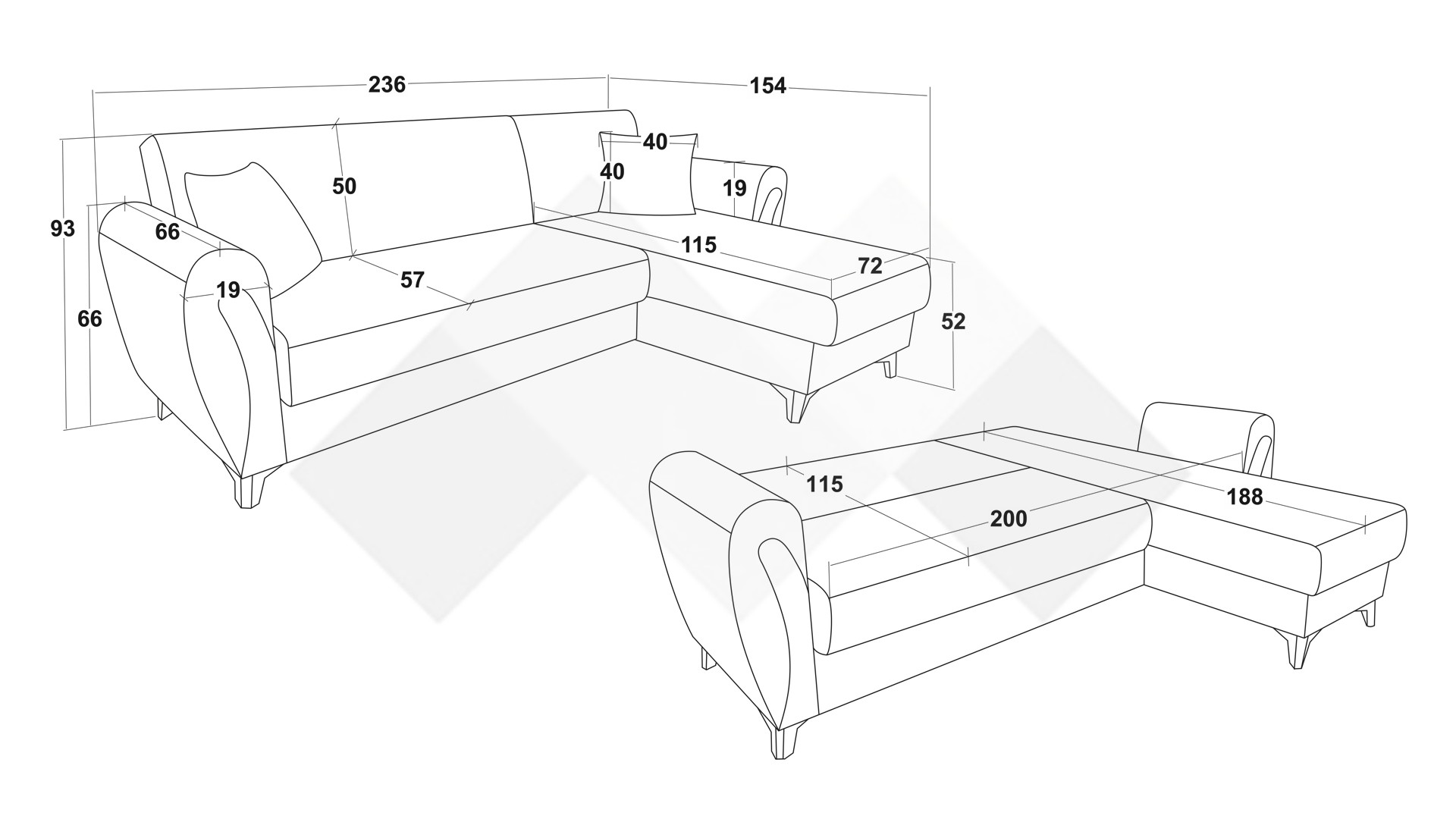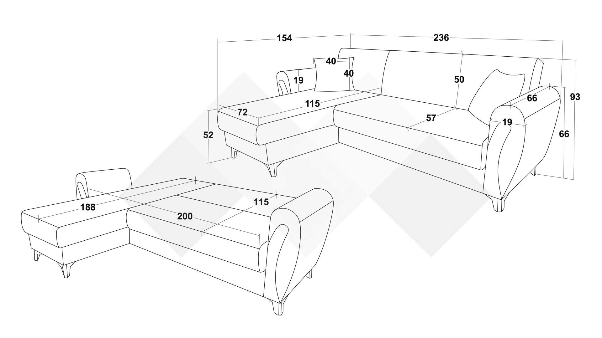 Д: 236 см Ш: 154 см В: 93 см