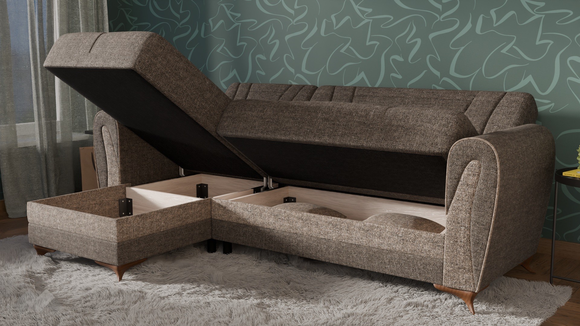 Практичните ракли под седалната част и под лежанката ти предлагат дискретно място за съхранение на завивки, възглавници и други вещи, които искаш да са ти под ръка, но същевременно прибрани. Дамаската е приятна на допир, изработена от здрав и устойчив текстил.