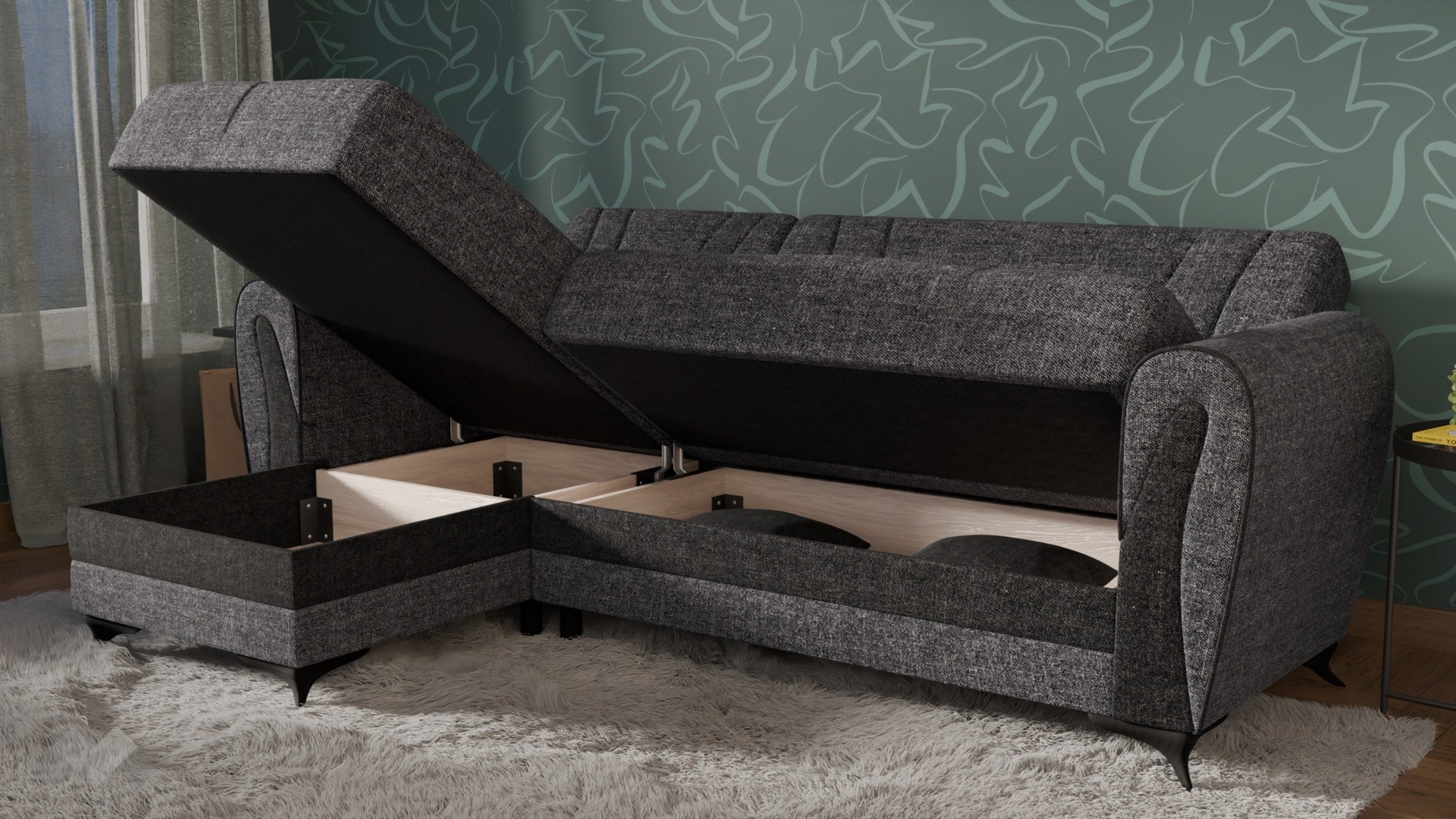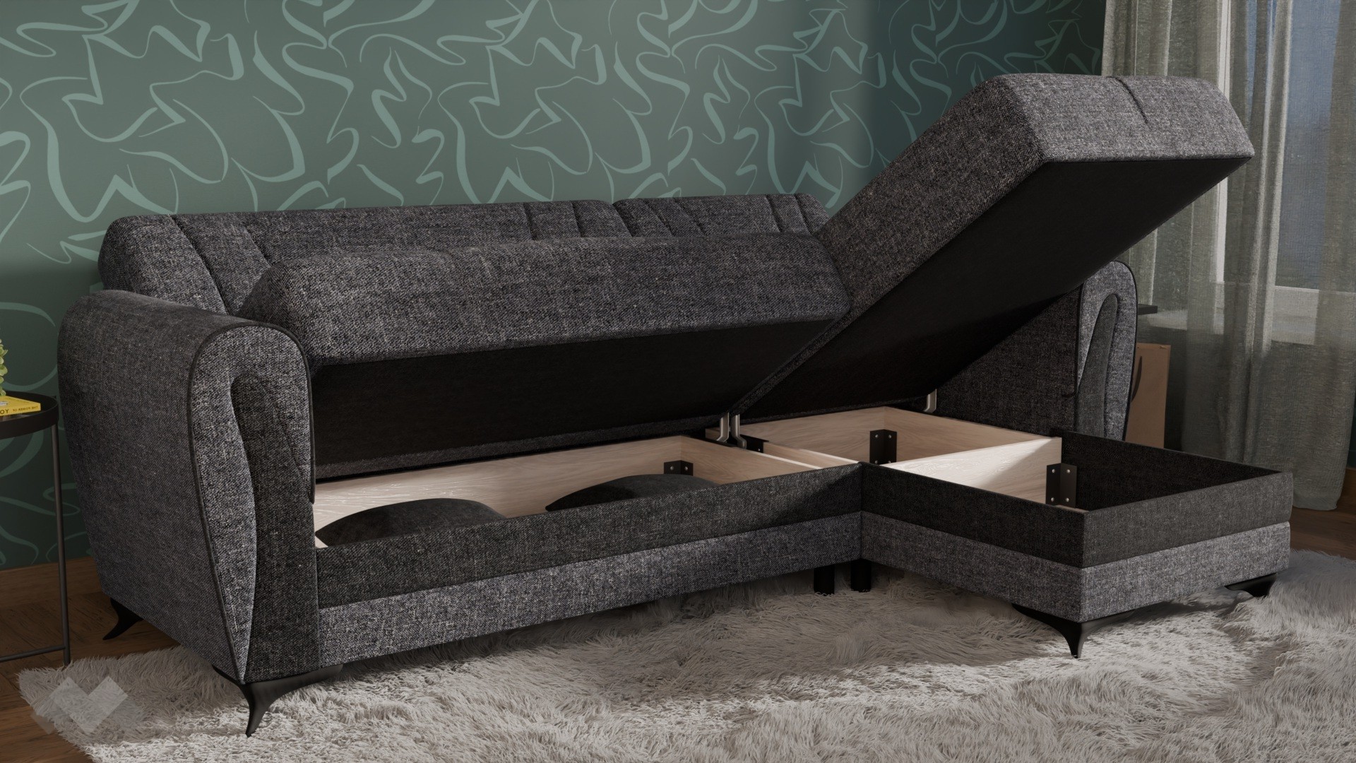 Практичните ракли под седалната част и под лежанката ти предлагат дискретно място за съхранение на завивки, възглавници и други вещи, които искаш да са ти под ръка, но същевременно прибрани. Дамаската е приятна на допир, изработена от здрав и устойчив текстил.