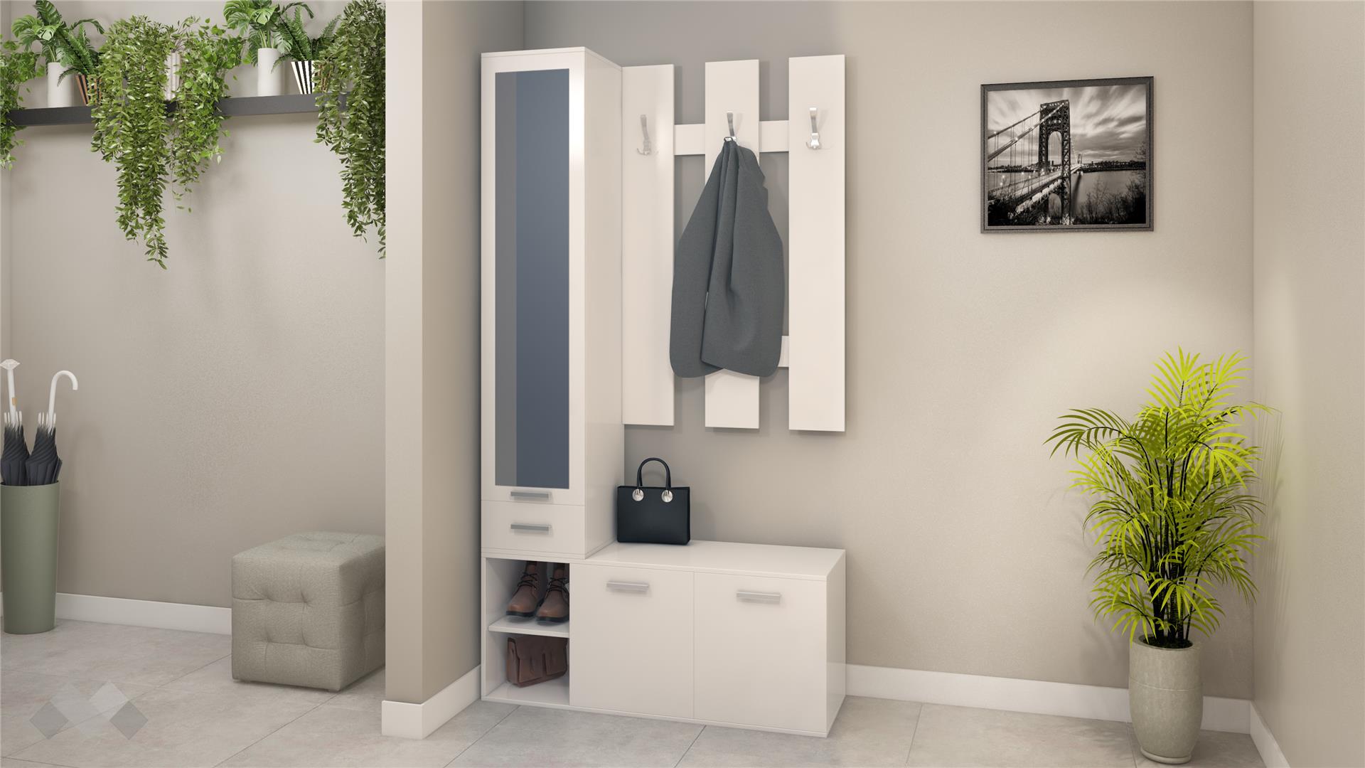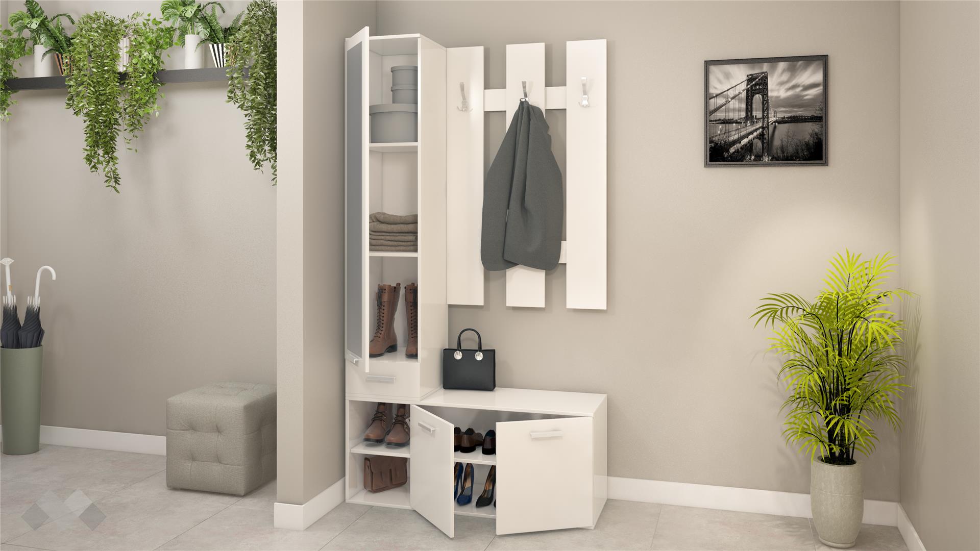 Съчетава се добре с всякакви цветове и аксесоари в твоя дом. Портманто Шайн ти предлага оптимално и функционално пространство за твоите вещи като: връхни дрехи, шапки, обувки, козметика и чадъри. Благодарение на чекмеджето, разполагаш с достатъчно място за организация на всякакви дребни вещи.