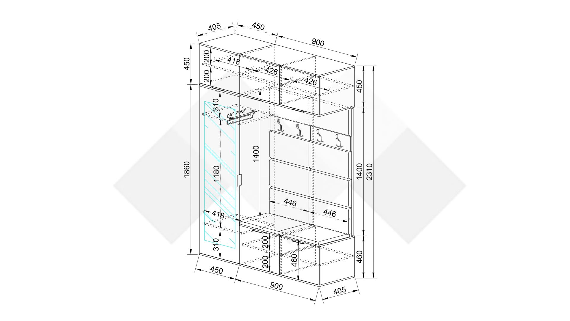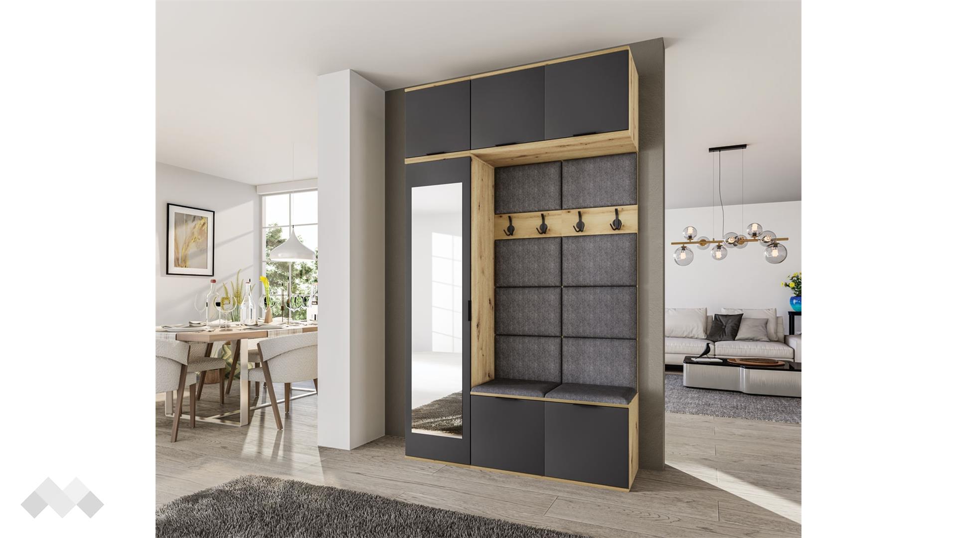 Има и три шкафа с вратички, удобни да организираш шапки, шалове или да прибереш резервните дрехи. Седалната част е тапицирана за по-голямо удобство и е място за твоята чанта или където да седнеш, докато се обуваш. Под нея пространството е оползотворено и разполагаш с още два шкафа за обувки или други вещи. На паното са монтирани четири двойни закачалки, на които да поставиш връхни дрехи, шалове или шапки и винаги да са под ръка.
