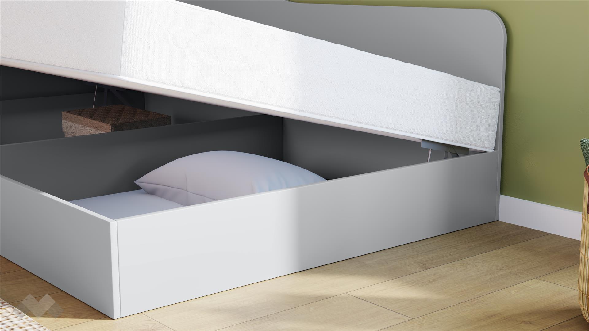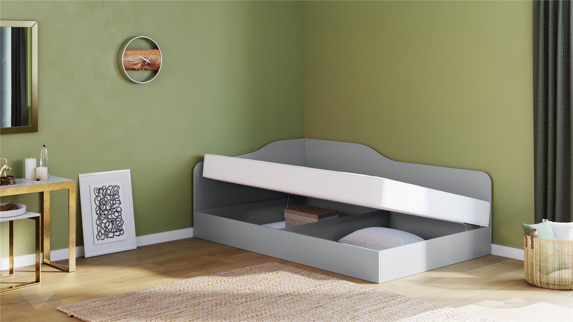 Подходящо за матрак с размери 120/190 см, леглото е идеално за детски стаи, гостни или малки спални. Леглото е с универсално разположение – по време на монтажа, изолиращата табла и механизма могат да се монтират отляво или от дясно, така че да пасне идеално на стаята. Включеният повдигащ пружинен механизъм осигурява лесен и бърз достъп до подматрачното пространство, което е перфектно за съхранение на спално бельо, играчки, сезонни дрехи и други вещи.