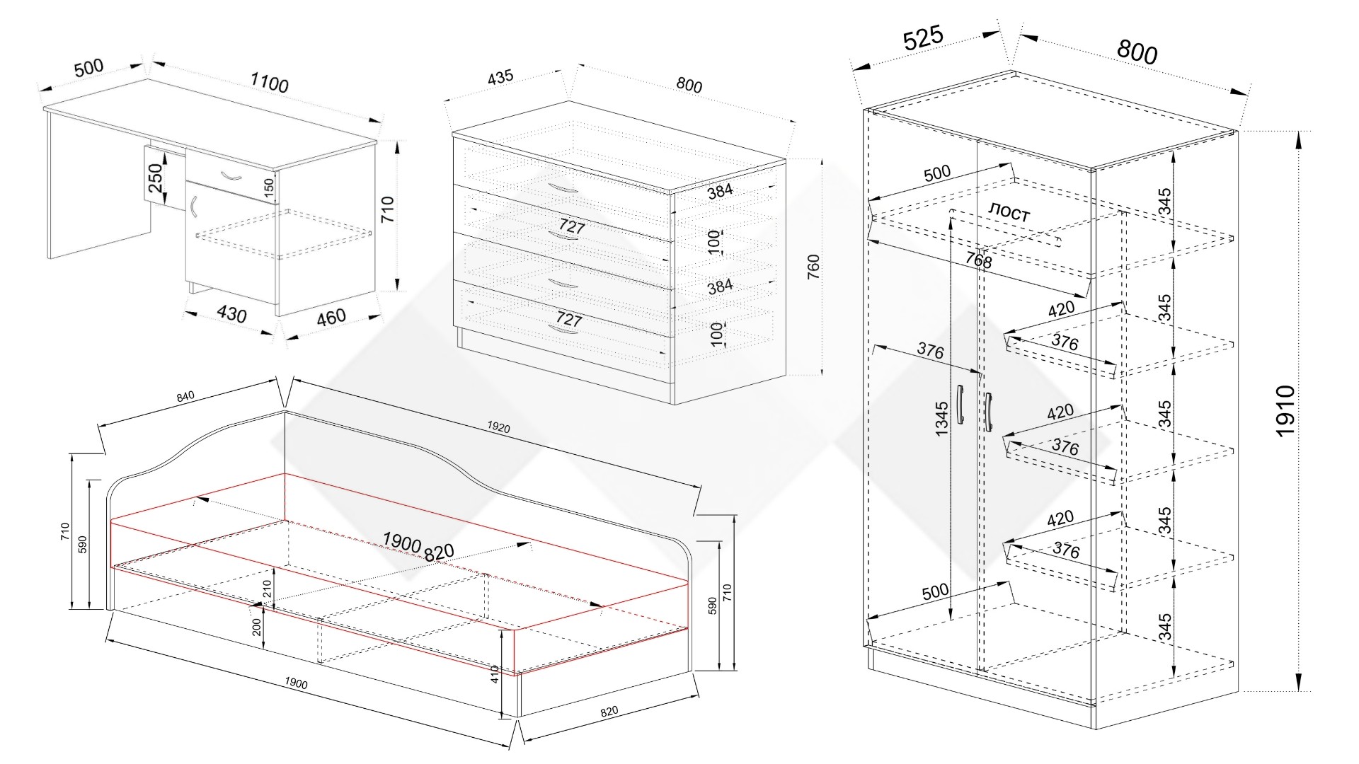 ⭐ Предимства: ✓ легло с меки линии ✓ за матрак 82/190 ✓ двукрилен гардероб с 4 рафта и лост за закачалки ✓ скрин с 4 чекмеджета ✓ бюро с шкаф и чекмедже ✓ семпъл дизайн ✓ повдигащ механизъм ✓ делител на подматрачното пространство ✓ механизъм за плавно затваряне ✓ качествена изработка ✓ 16 мм ПДЧ