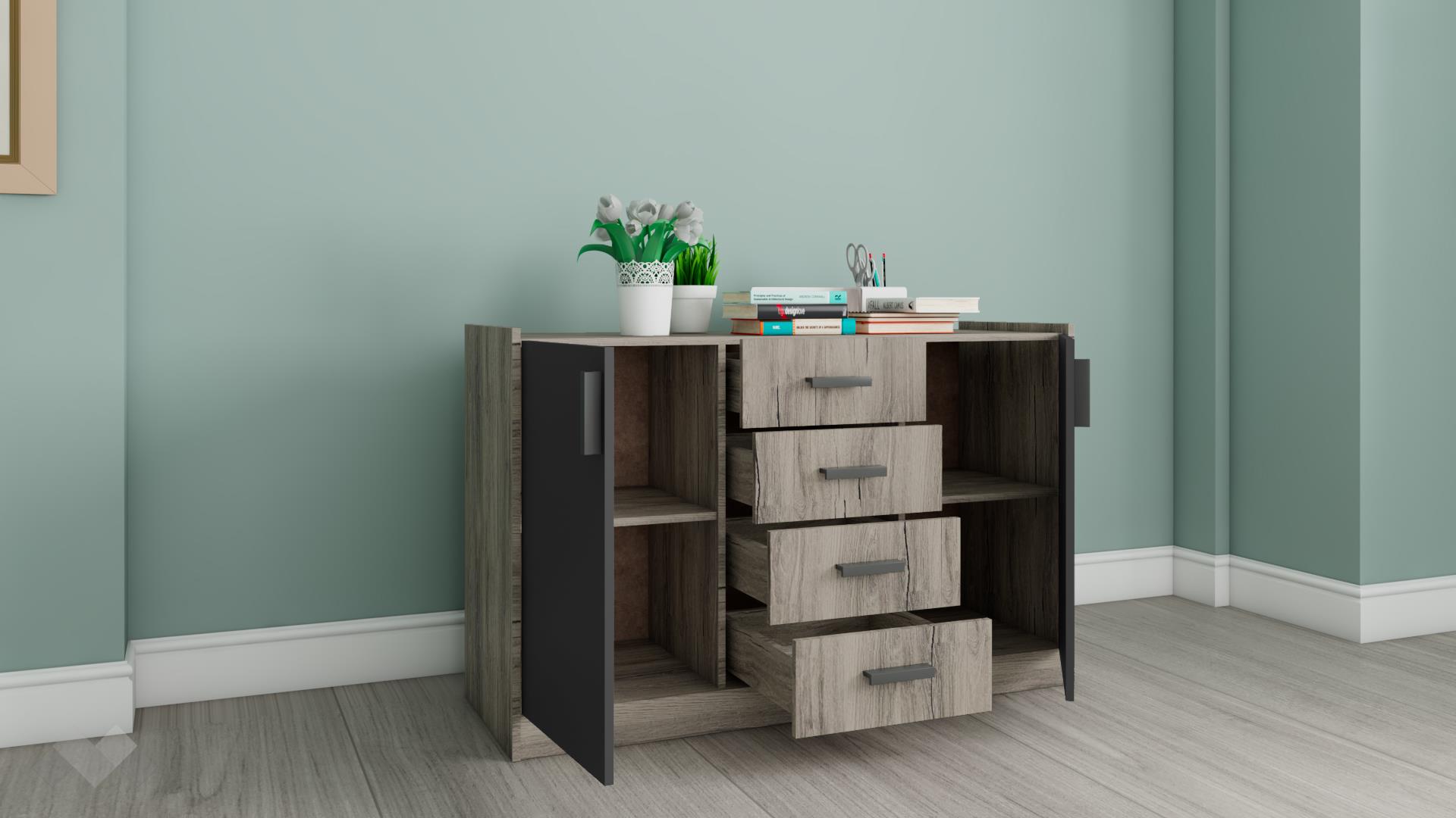 ⭐ Предимства: ✓ 4 чекмеджета ✓ 2 затворени шкафа ✓ компактен и практичен ✓ модерен винтидж декор с WNR структура ✓ качествена изработка ✓ 16 мм ПДЧ