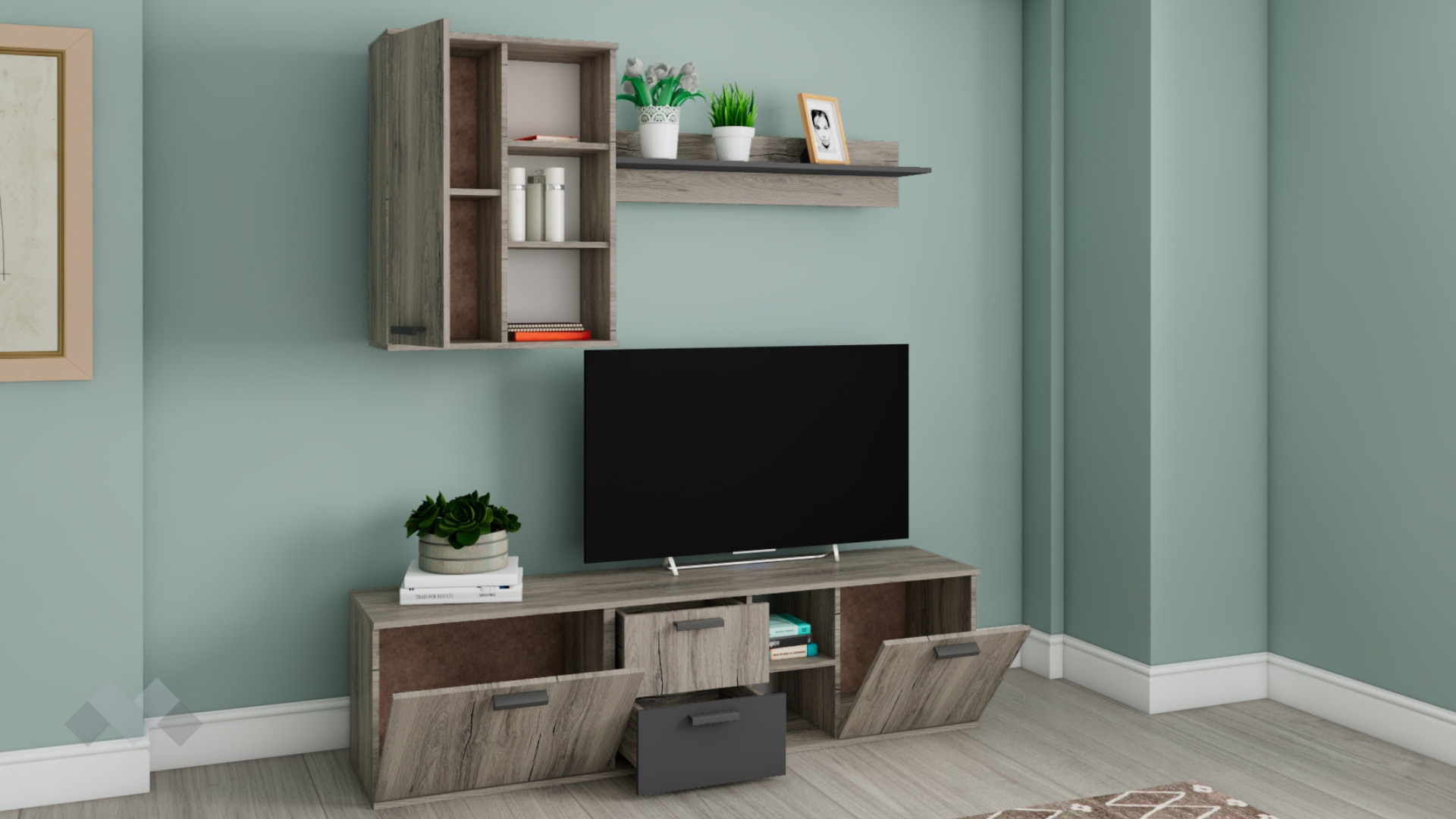 ⭐ Предимства: ✓ модерен декор с WNR структура ✓ множество шкафове ✓ изчистен дизайн ✓ етажерка ✓ открити рафтове ✓ качествена изработка ✓ 16 мм ПДЧ