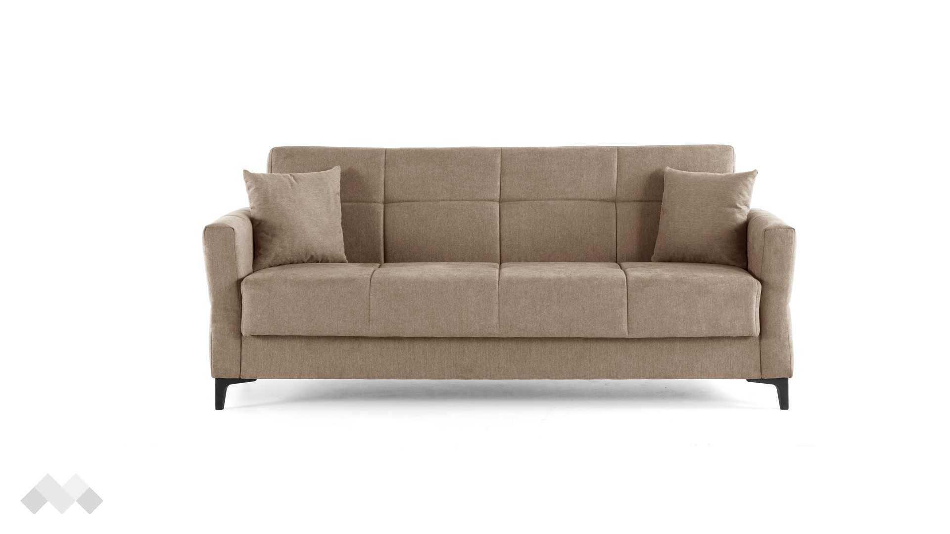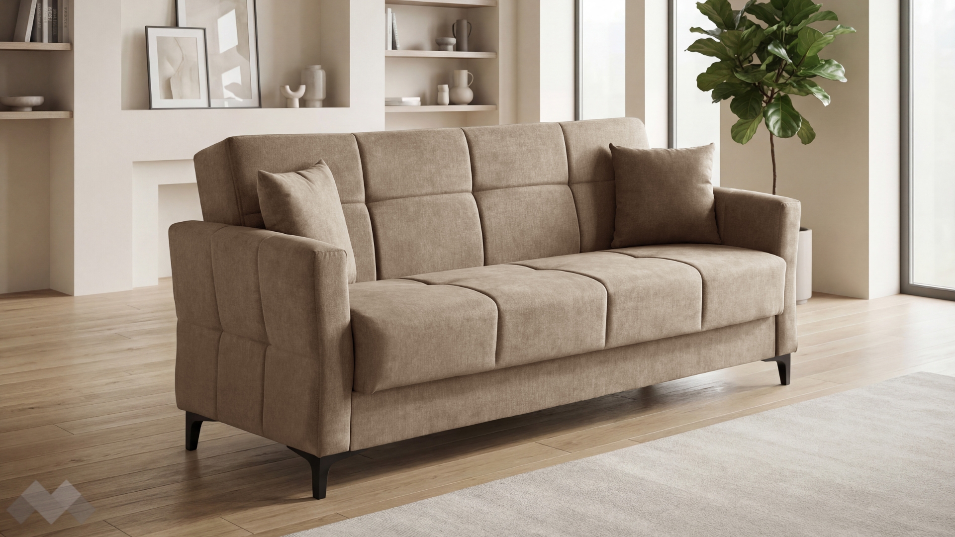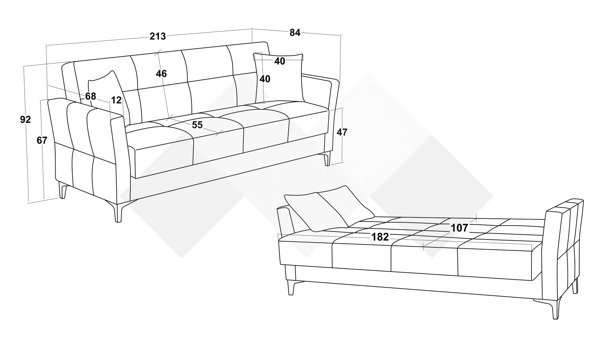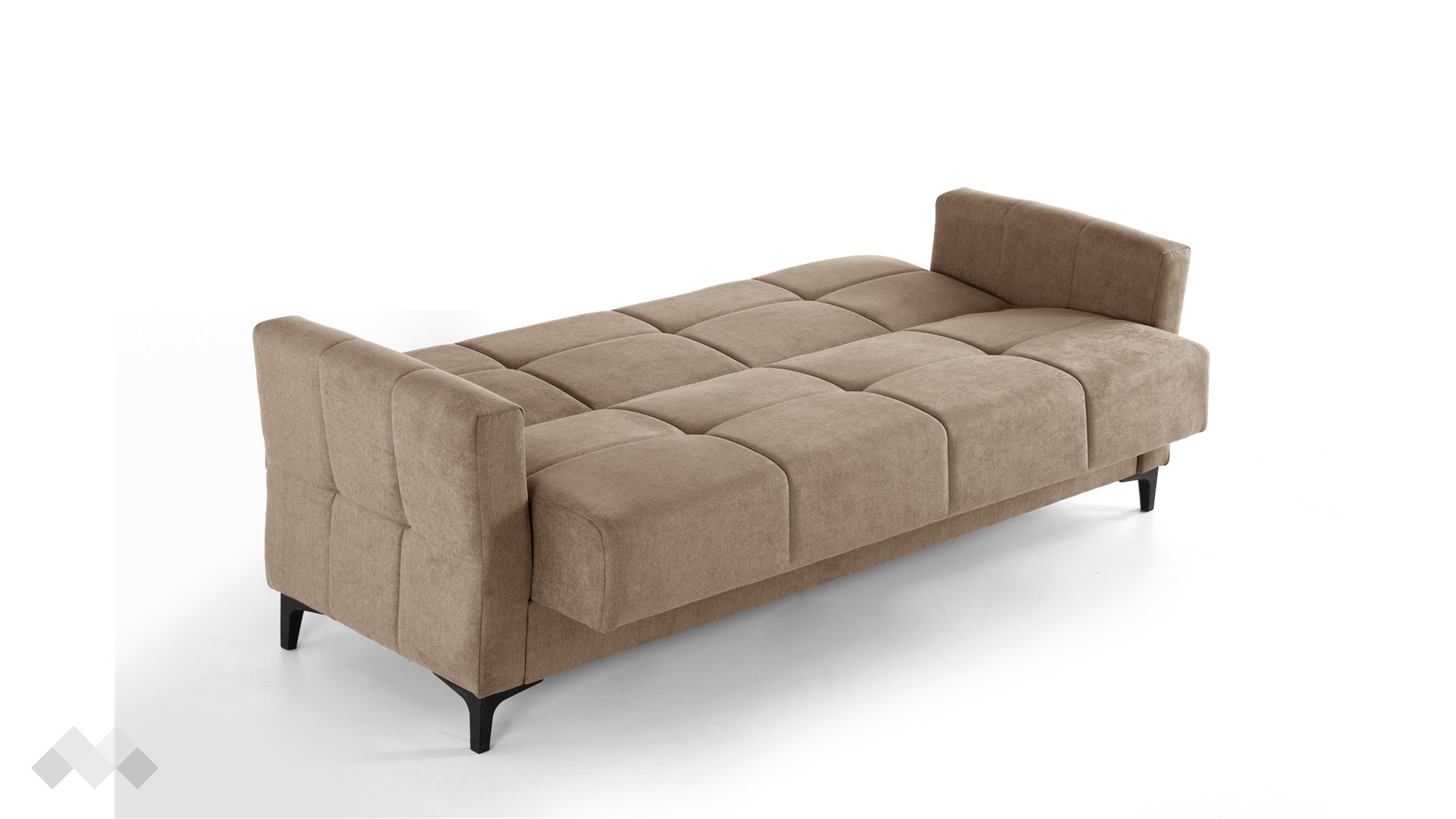 С помощта на клик-клак механизма диванът се разгъва лесно и бързо, превръщайки се в удобно легло с площ за сън 182/107 см. Това го прави подходящ както за ежедневна почивка, така и за нощуване на гости. Под седалката е разположена просторна ракла, която предлага удобно място за съхранение на завивки, възглавници и други вещи, като помага да поддържаш ред в помещението. Дамаската е мека, приятна на допир и изработена от устойчив текстил.