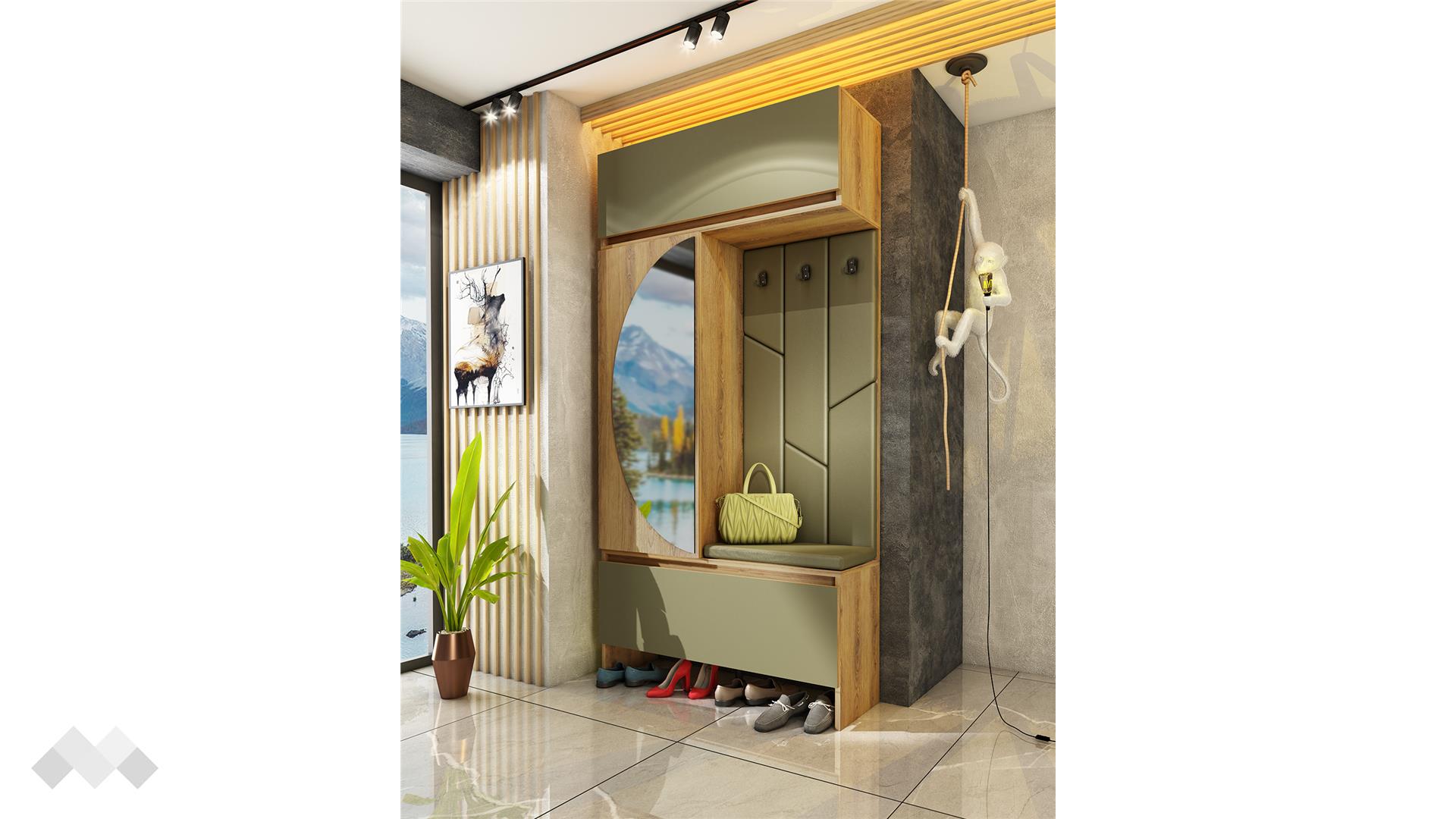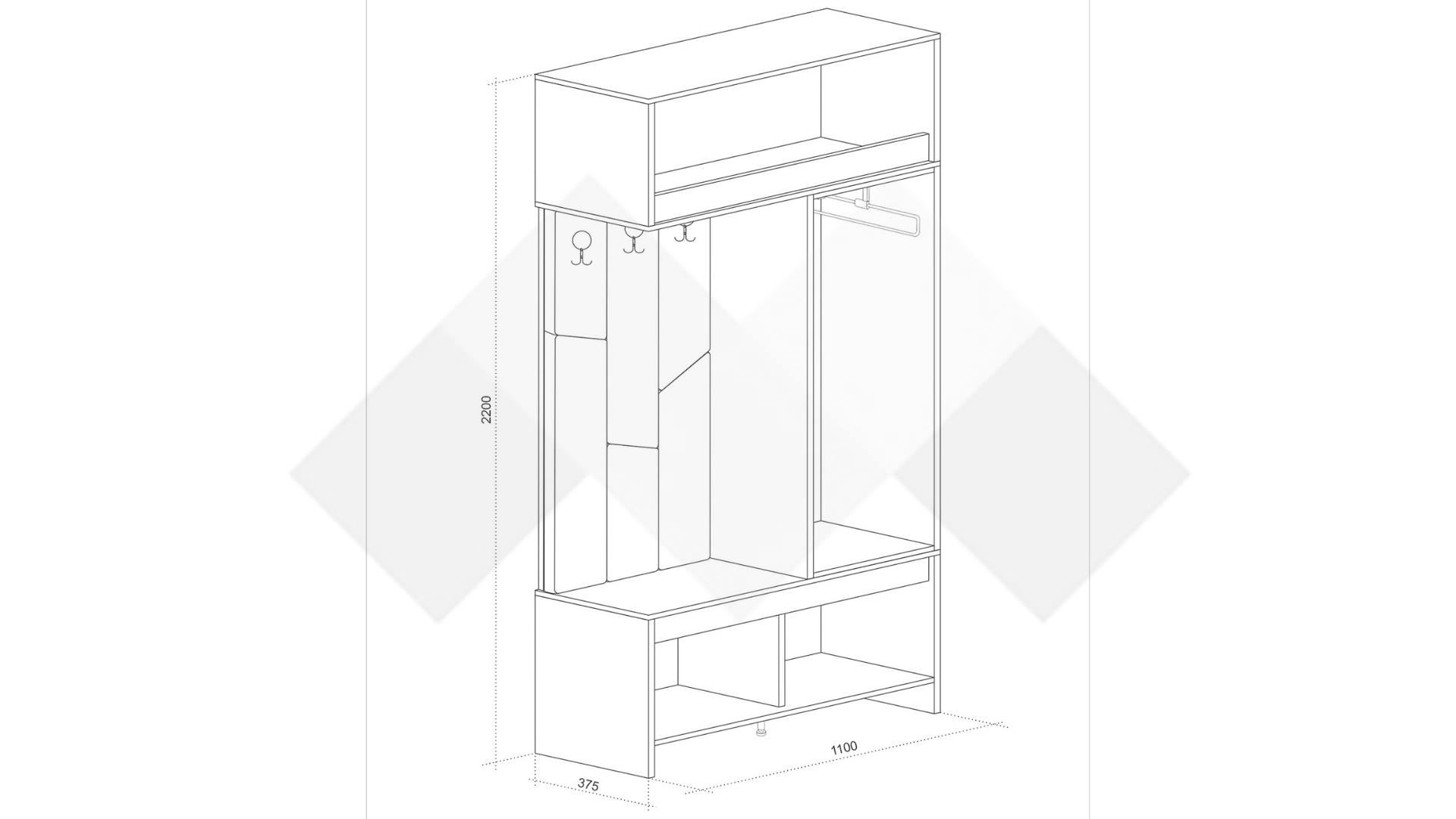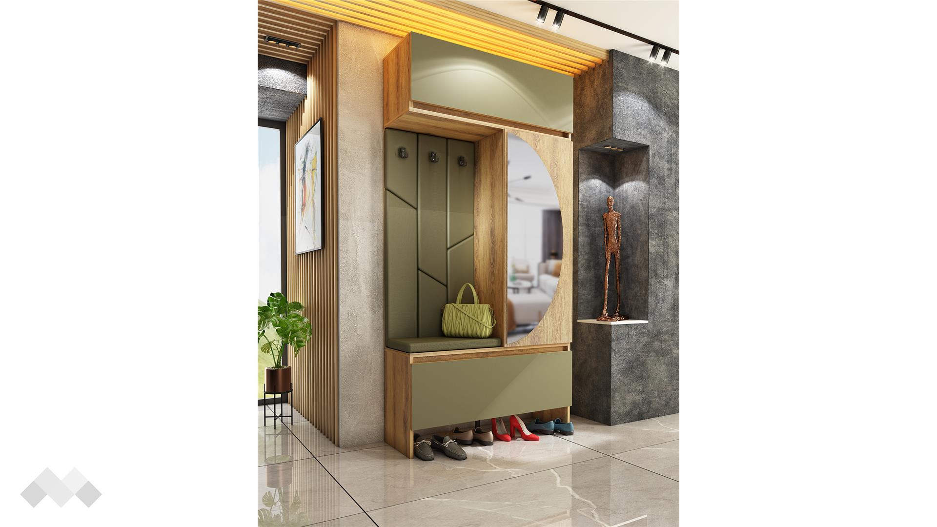 Основният акцент е модулът със закачалки, който е тапициран с мека текстилна дамаска в стилен маслиновозелен цвят, придавайки уют и изисканост на интериора. Освен стилен акцент, тапицираната зона осигурява комфорт при облягане, а тапицираната седалка при сядане.