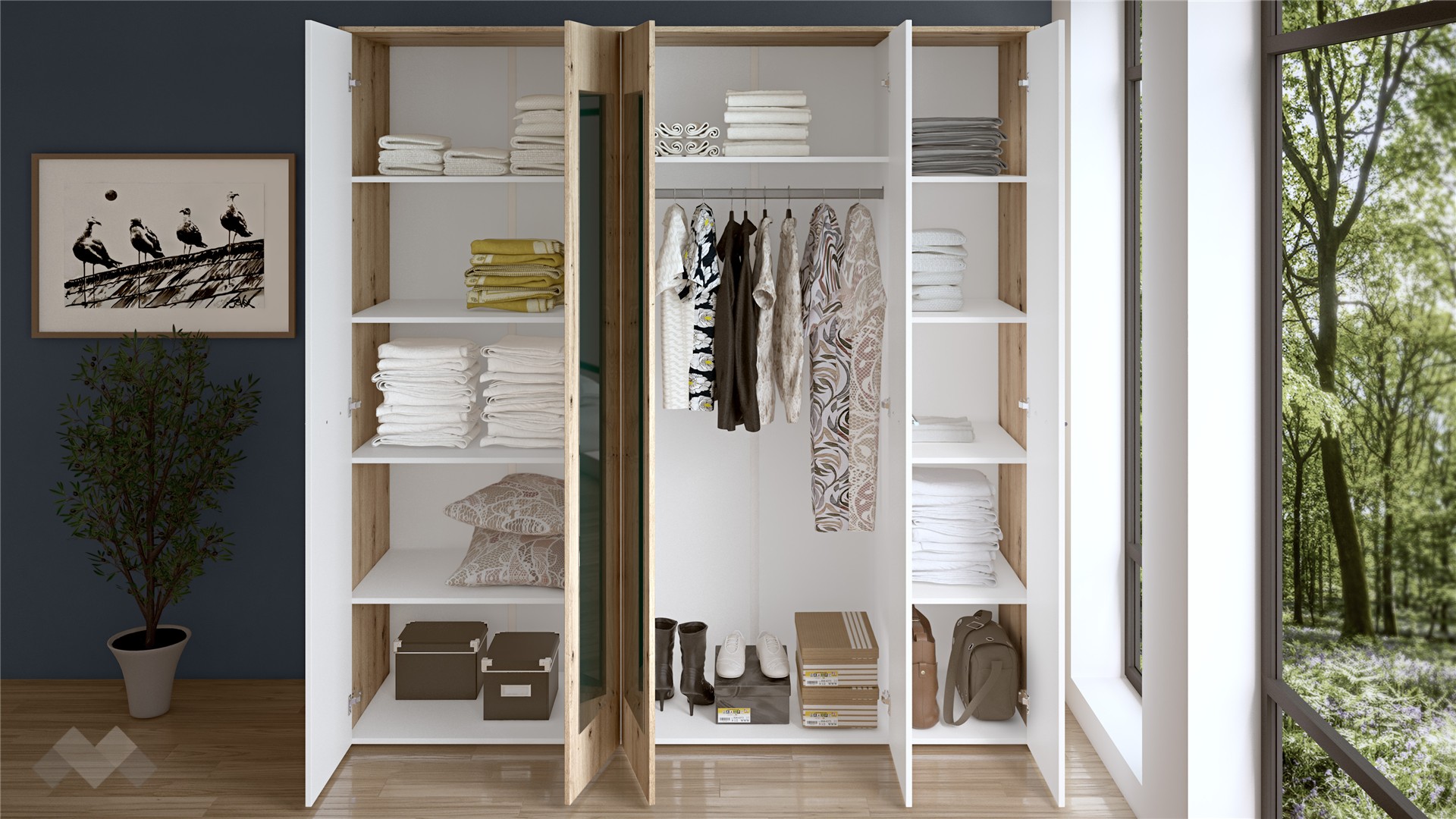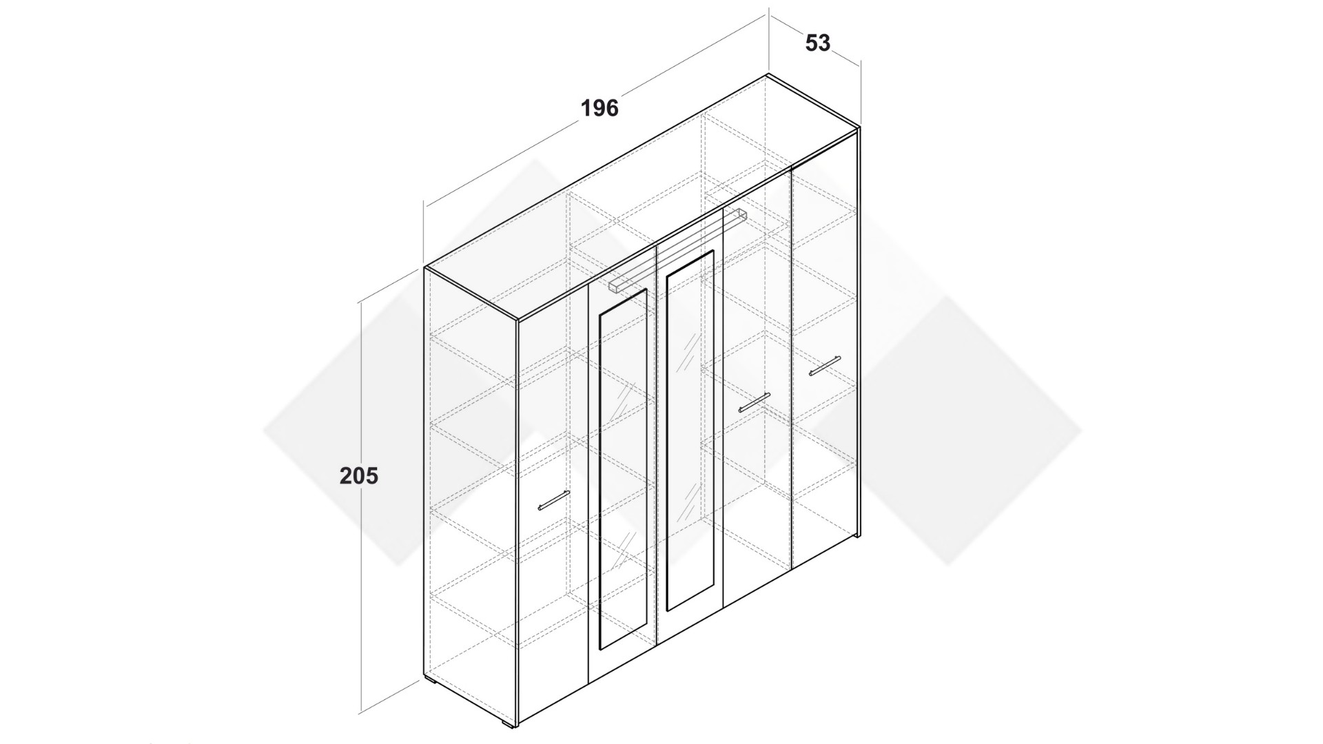 Петкрилен гардероб Вангард съчетава практичност и добре обмислено разпределение, благодарение на което ще можеш да подредиш и съхраняваш вещите си, както ти е удобно. Моделът разполага с 9 рафта, на които можеш да поставиш спално бельо, дрехи и кутии за съхранение на по-дребни вещи, както и с лост за закачалки, на който ще намериш място за елегантните си тоалети. Разполагаш и с 2 огледала, на които ще се погрижиш за външния си вид, за да се чувстваш винаги комфортно и удобно.