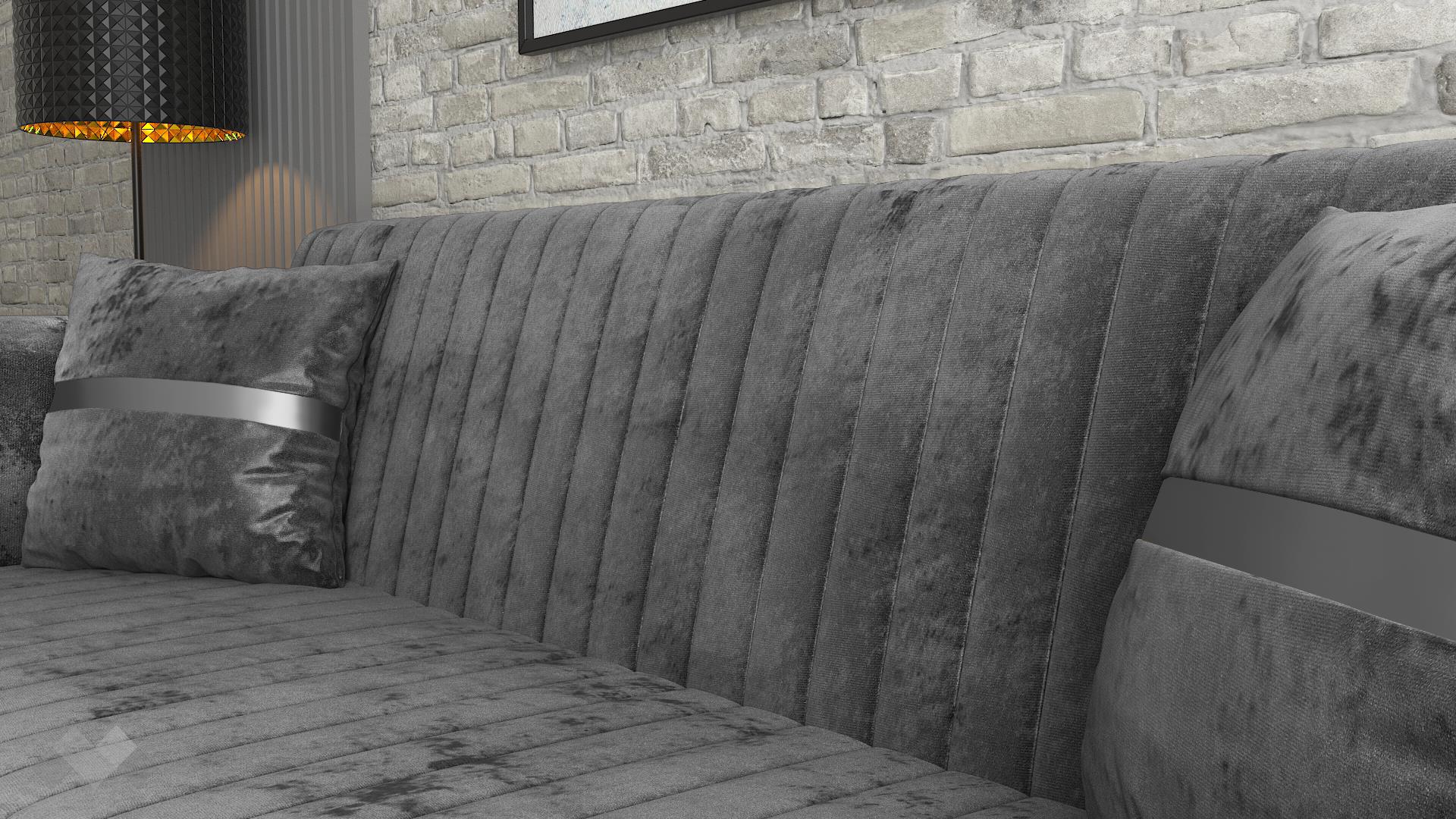 Диван Ваяна впечатлява с модерен дизайн, изискана визия и практични функции. Вертикалните шевове по дамаската, в съчетание с луксозните сребристи акценти по възглавниците, краката и подлакътниците, придават елегантен и завършен вид. Топлият сив цвят и меката на допир дамаска създават уютна атмосфера и стилно присъствие във всеки интериор.