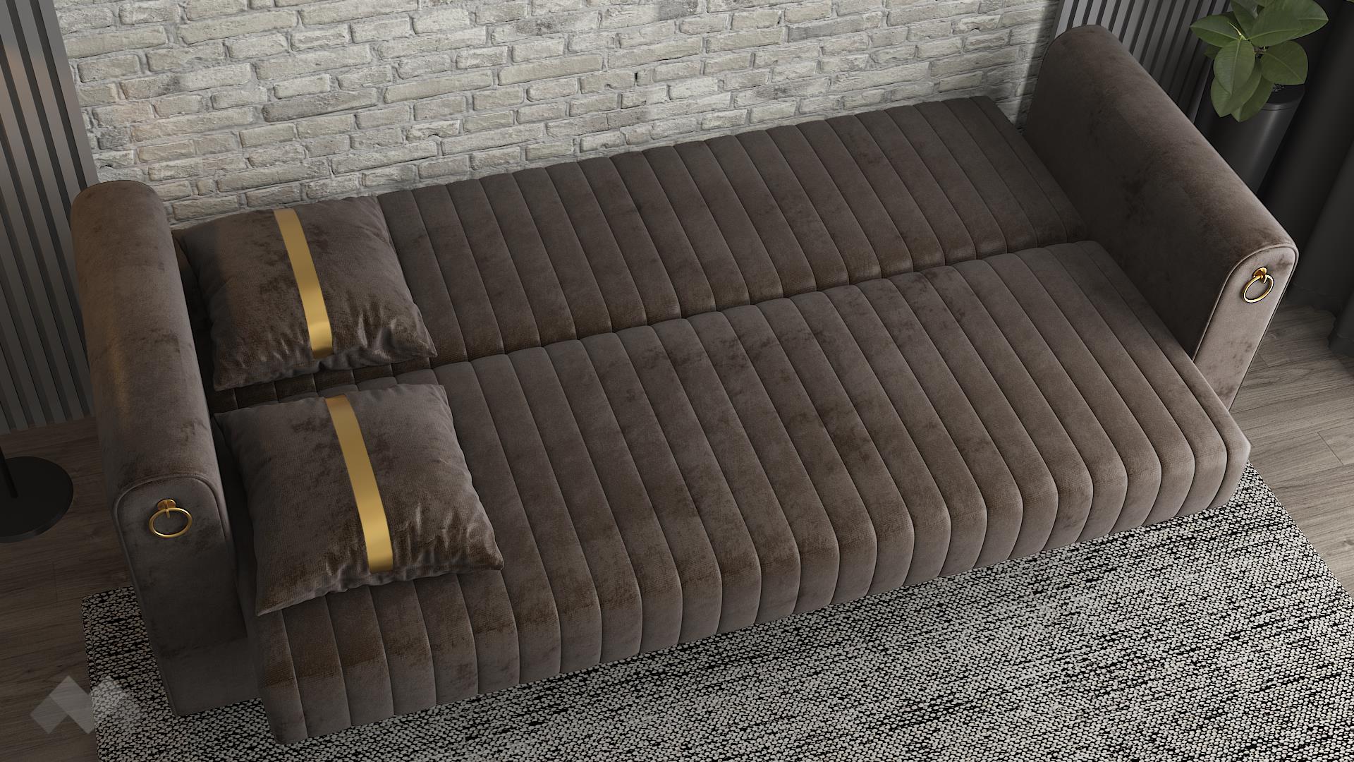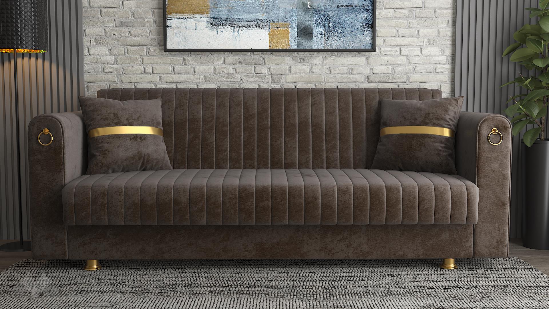 Диван Ваяна впечатлява с модерен дизайн, изискана визия и практични функции. Вертикалните шевове по дамаската, в съчетание с луксозните златисти акценти по възглавниците, краката и подлакътниците, придават елегантен и завършен вид. Топлият кафяв цвят и меката на допир дамаска създават уютна атмосфера и стилно присъствие във всеки интериор.