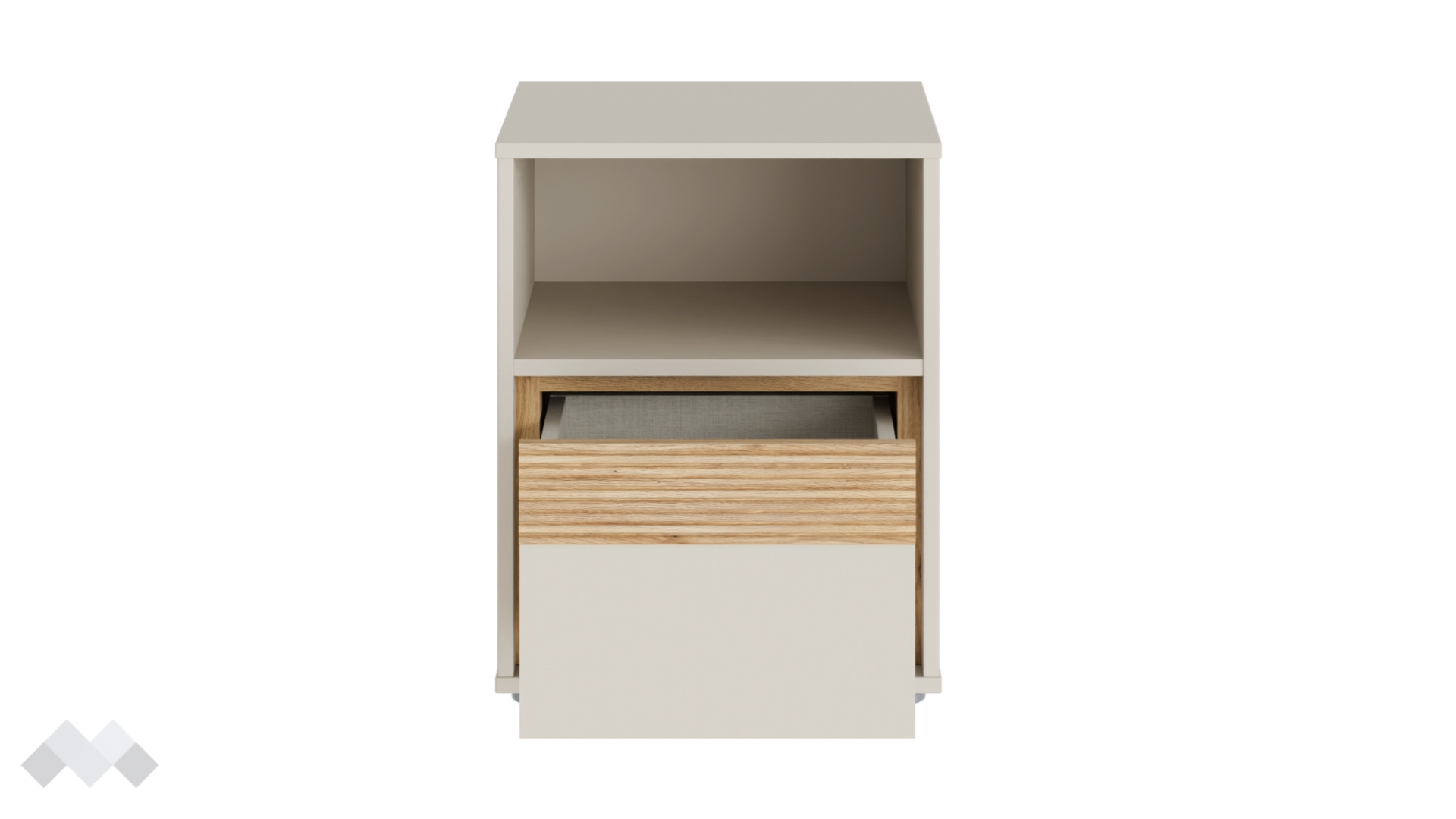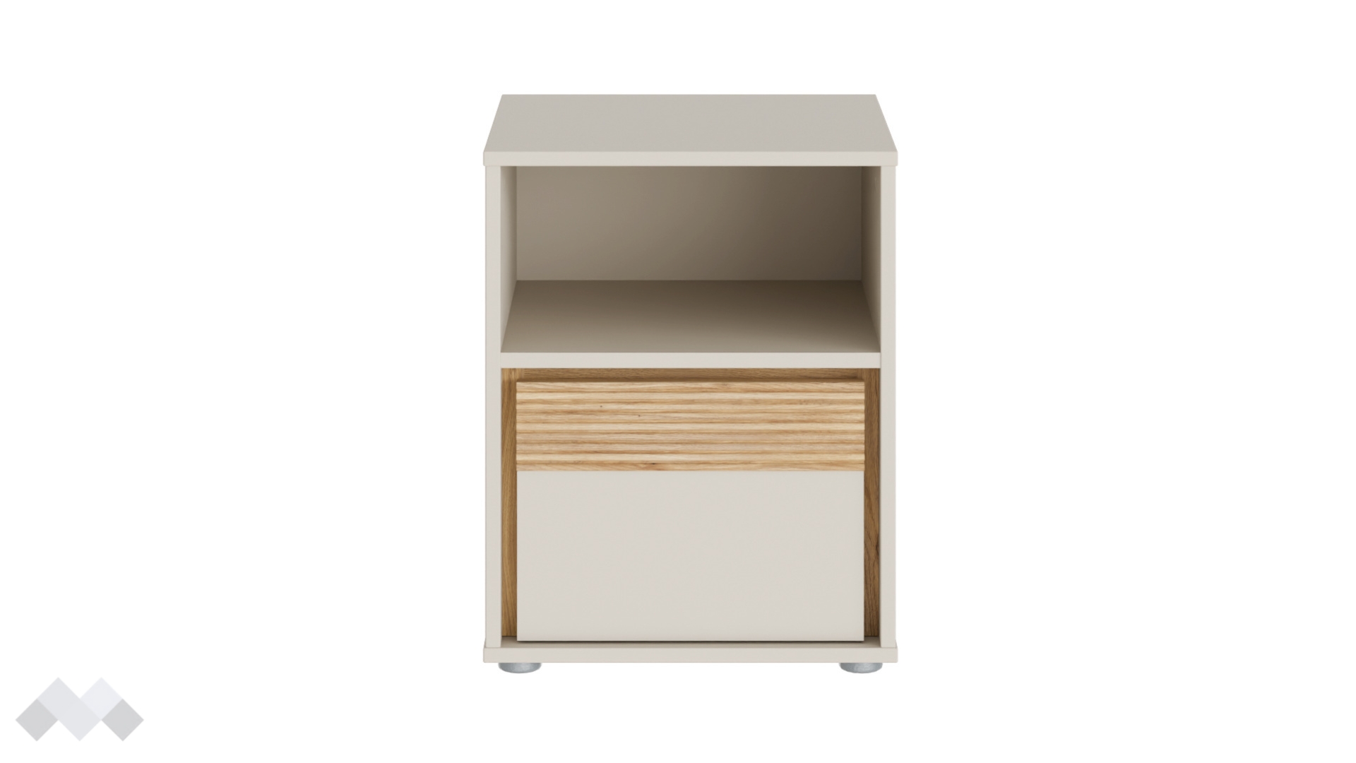 Шкафчето разполага с едно чекмедже, идеално за съхранение на лични вещи, книги или други дребни предмети, които искате да са подръка, но скрити от погледа. Чекмеджето е снабдено с пуш механизъм, осигуряващ леко и безшумно отваряне и затваряне с едно натискане, което допринася за изчистения дизайн без дръжки.
