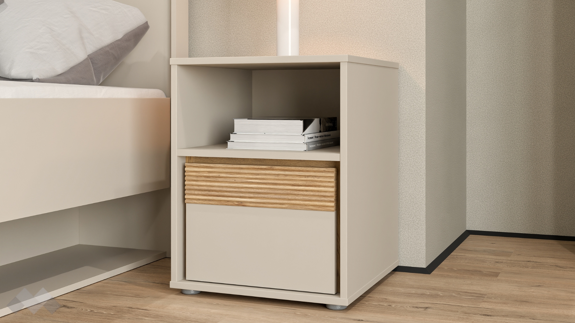 Над чекмеджето е разположен отворен рафт, който е перфектен за поставяне на любима книга, очила, мобилен телефон или други често използвани предмети. Горният плот на шкафчето е подходящ за нощна лампа, будилник или декоративни елементи, създавайки уютна атмосфера в спалнята.