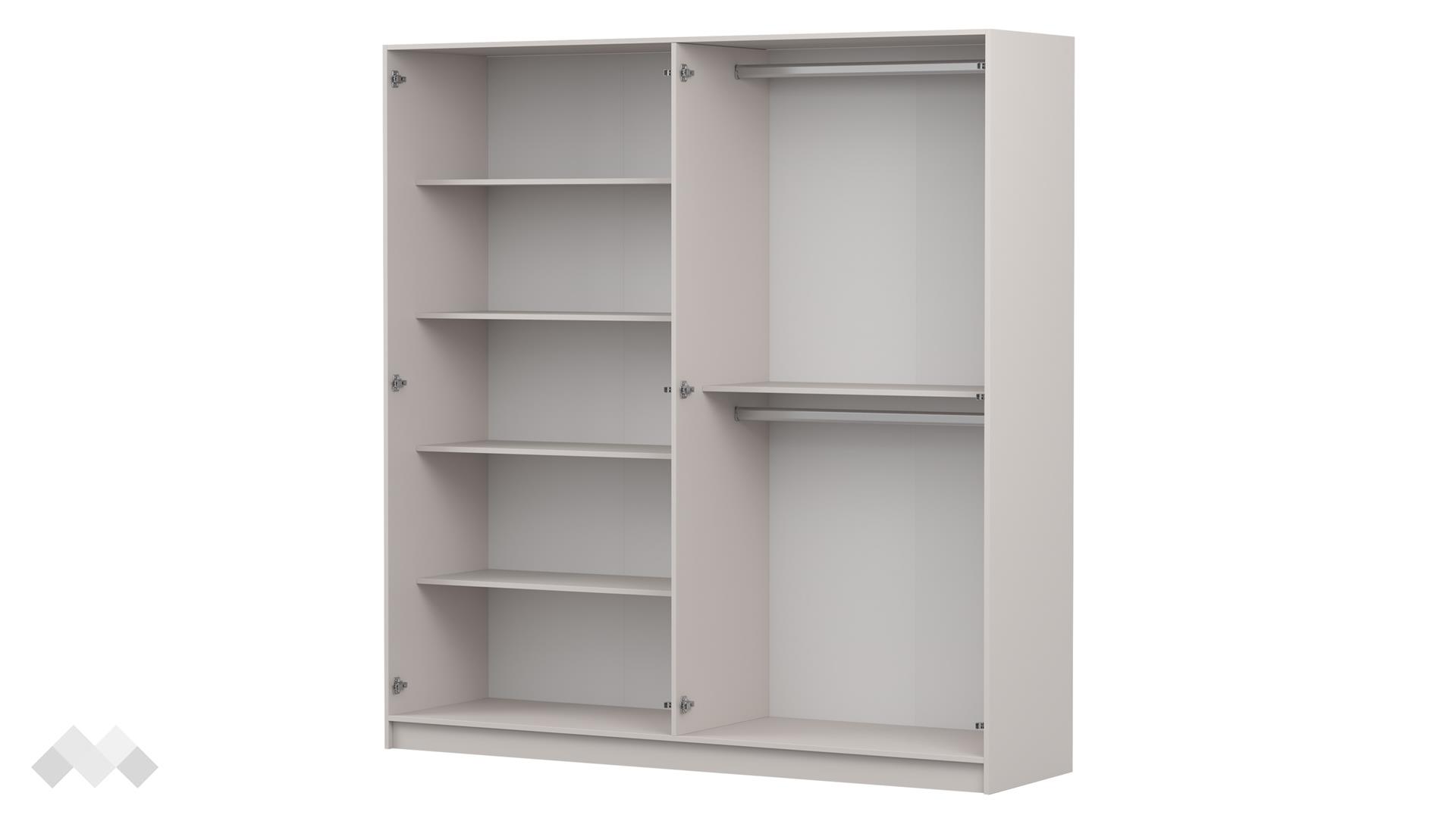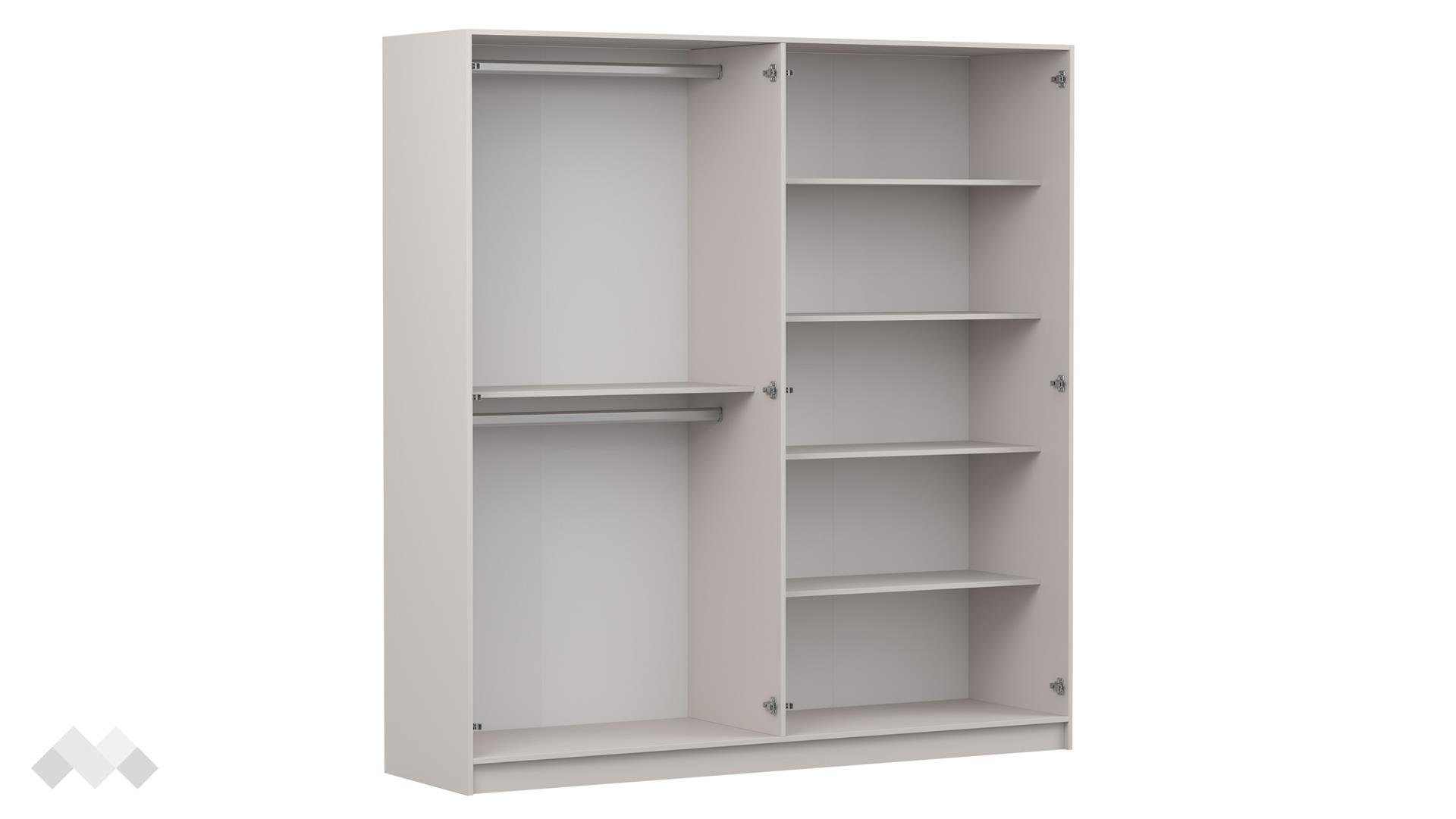 Гардеробът предлага добре организирано вътрешно пространство с 2 лоста за закачалки и 5 рафта, които осигуряват удобство при подредбата на различни видове облекла и аксесоари. Това го прави отличен избор за всяко домакинство, което търси ред и ефективно разпределение на пространството.