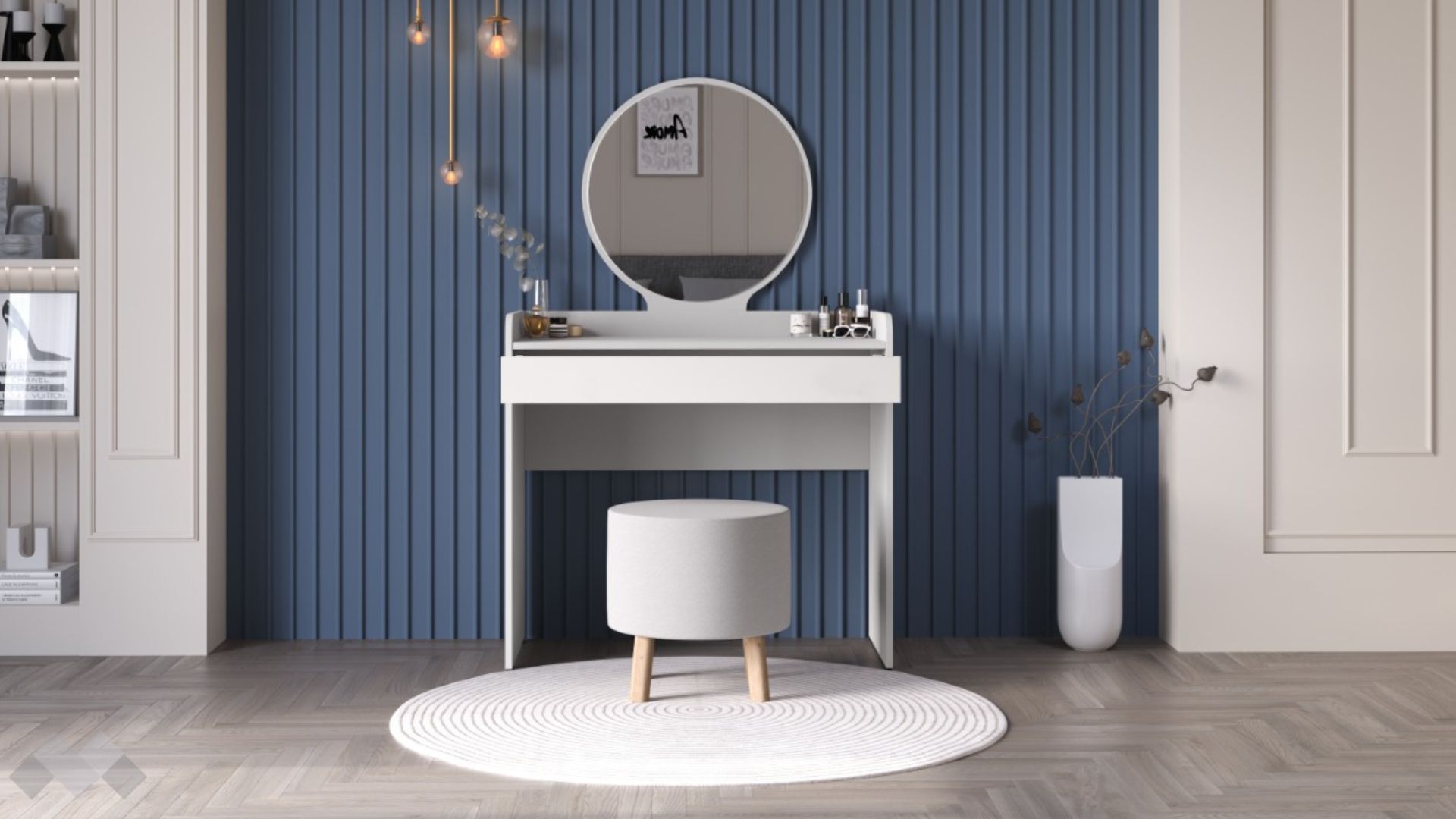 Тя разполага с едно просторно чекмедже с вътрешно разпределение, което само може да ти е в услуга - помага ти да организираш своите вещи. Има и страхотно кръгло огледало, което е незаменим помощник на твоята визия. Плотът е просоторен и ти предоставя още пространство за козметичните ти продукти.