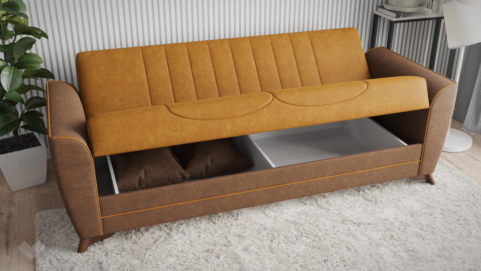 Диван Ялта е и функционален – с минимално усилие, за миг се превръща в широко легло, благодарение на клик-клак механизма, а под седалката се крие просторна ракла, където да съхраняваш завивки, възглавници и други вещи. Дамаската е приятна на допир, изработена от здрав, устойчив на износване и замърсявания текстил, а цветът допринася за неговата уникална идентичност.