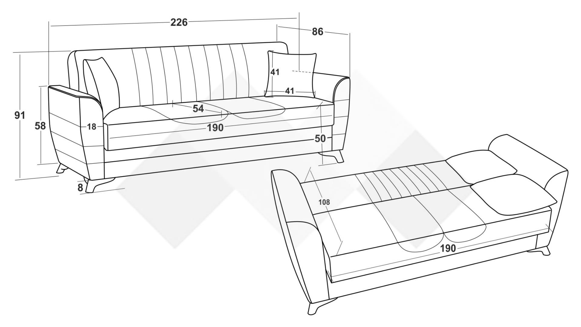Диванът има здрава конструкция от масивна дървесина и ПДЧ, отличаващи се с устойчивост за дълъг период на употреба. Моделът се предлага в цветови комбинации, подходящи както за класически, така и за по-модерен интериор.