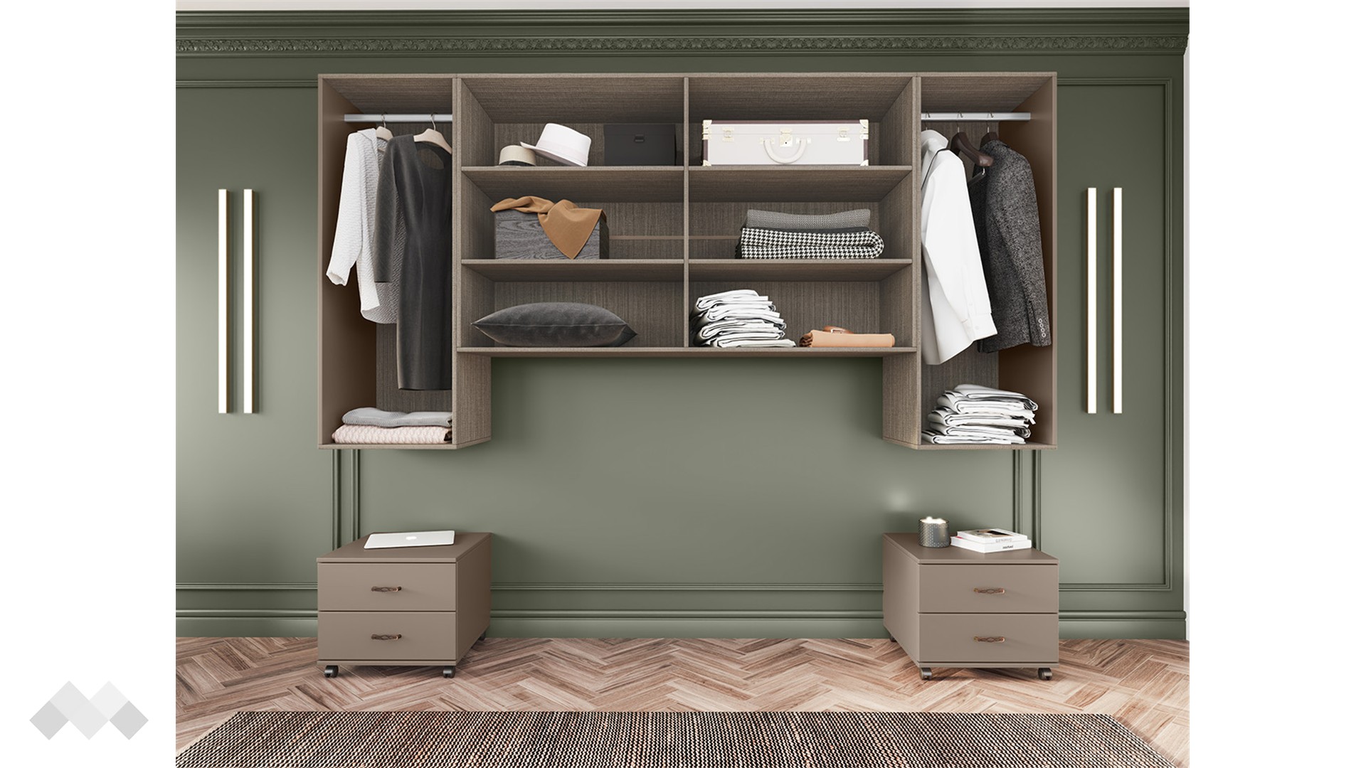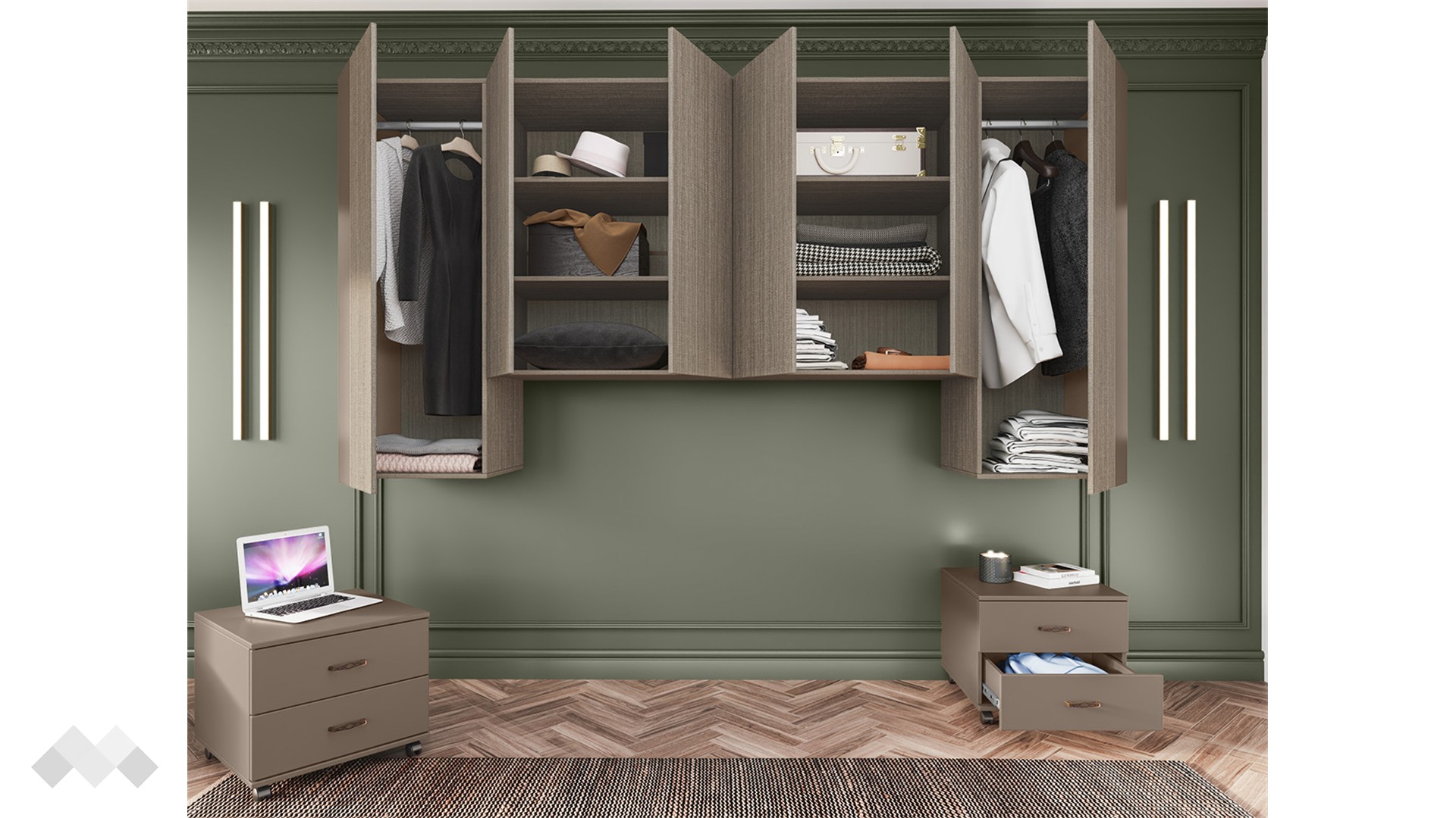 Гардеробът е проектиран така, че да се използва пространството над леглото, предоставяйки максимално удобство и лесен достъп до съхраняваните вещи. С него ще разполагаш с две просторни отделения с лостове, в които можеш да закачиш тоалетите си на закачалки. Сгънатите дрехи, кутии за съхранение или други аксесоари ще намерят място в двете отделения с рафтове.