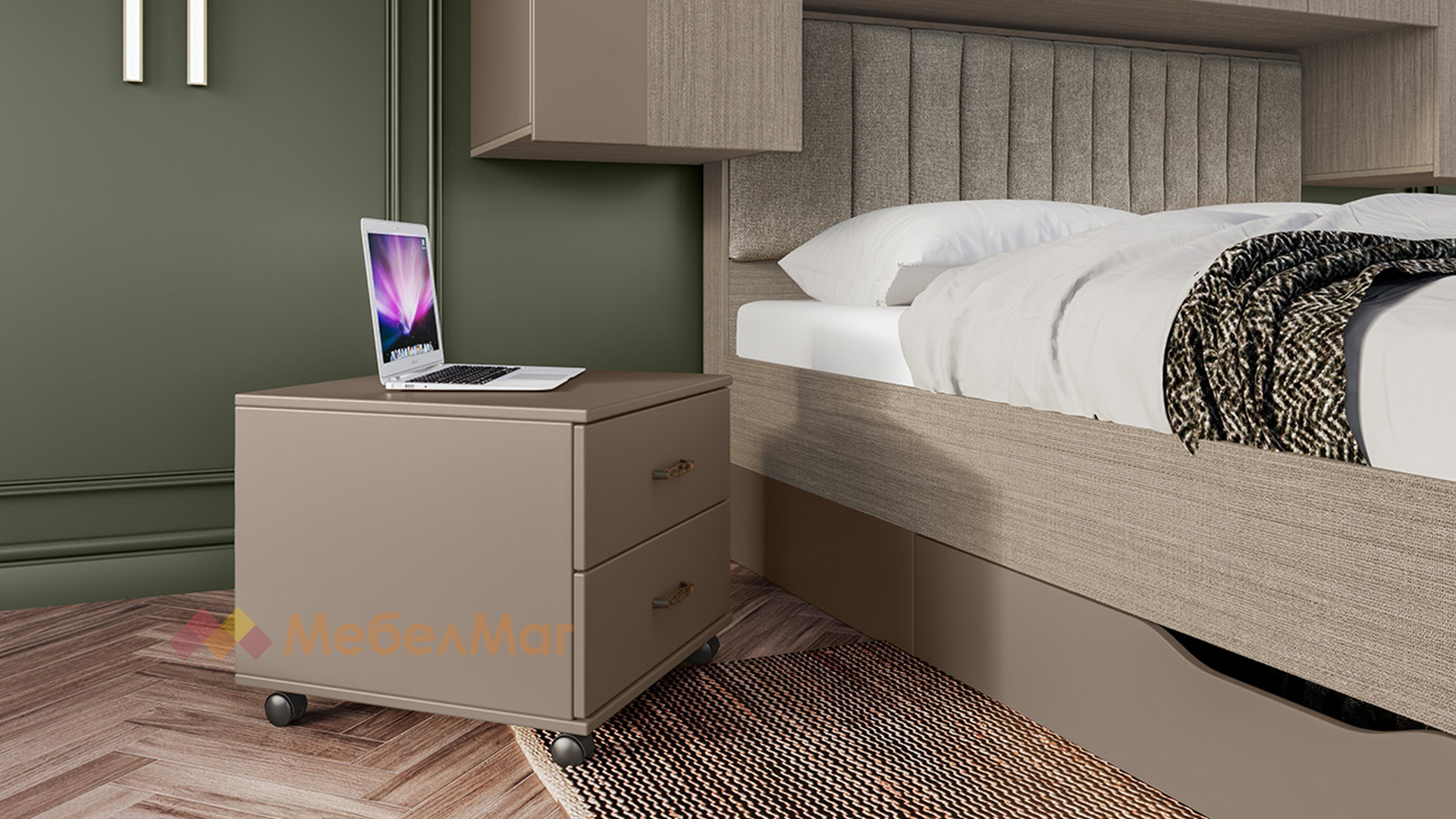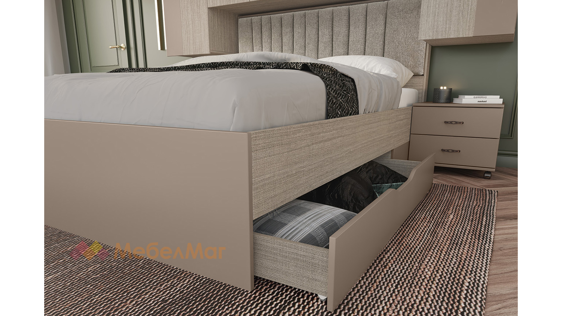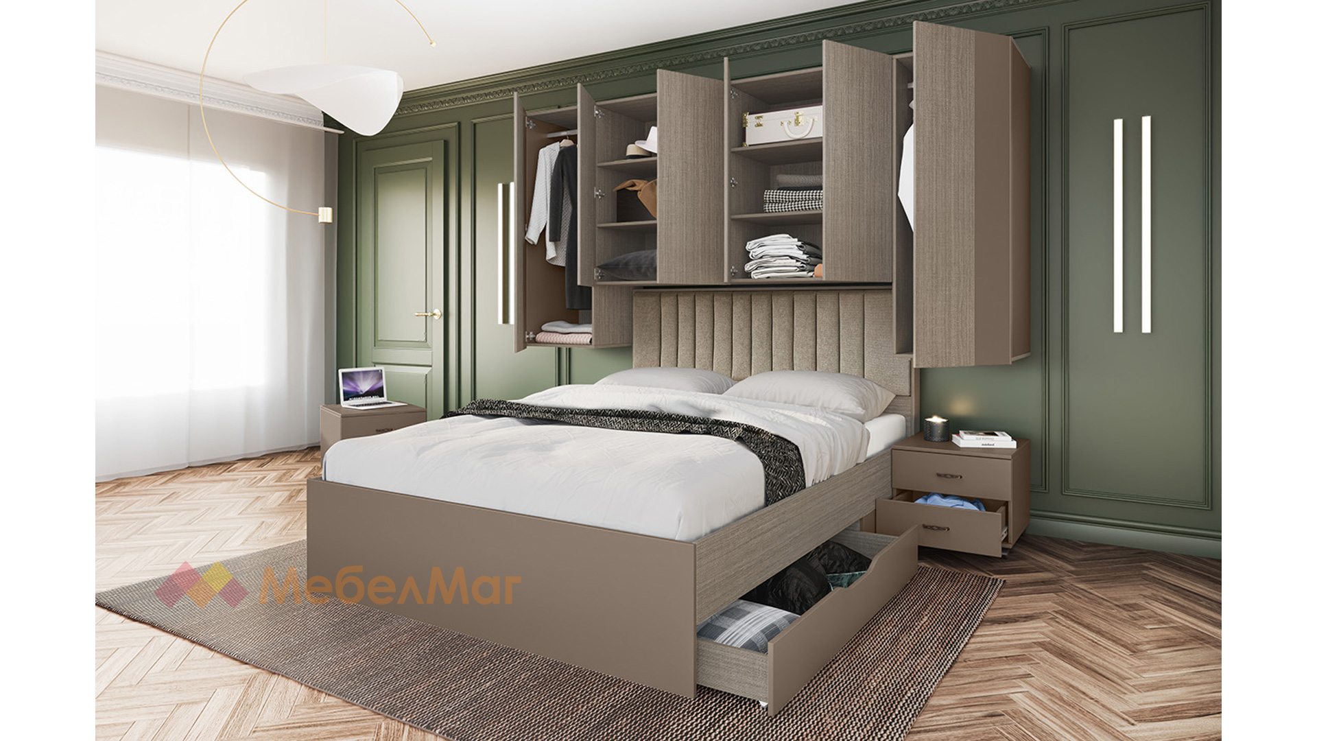 ⭐Предимства: ✓ спалня с чекмеджета ✓ тапицирана табла ✓ гардероб ✓ 2 нощни шкафчета ✓ плавно затваряне ✓ разчупен дизайн ✓ модерен декор ✓ практично разпределение ✓ качествена изработка ✓ 16 мм ПДЧ