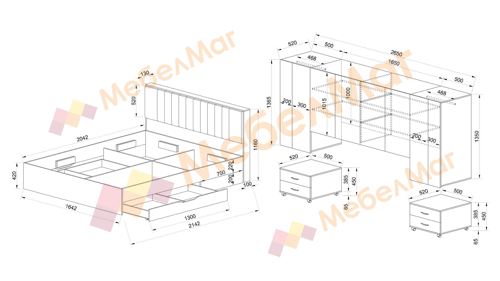 В комплекта са включени и две удобни нощни шкафчета, които допълват модерния вид на гардероба и създават усещане за симетрия и баланс. На тях можеш да поставиш вещите, които искаш да са близо до теб преди сън, за да се чувстваш винаги удобно. Чекмеджетата им са снабдени с механизми за пълно изтегляне и плавно затваряне за по-голямо удобство.
