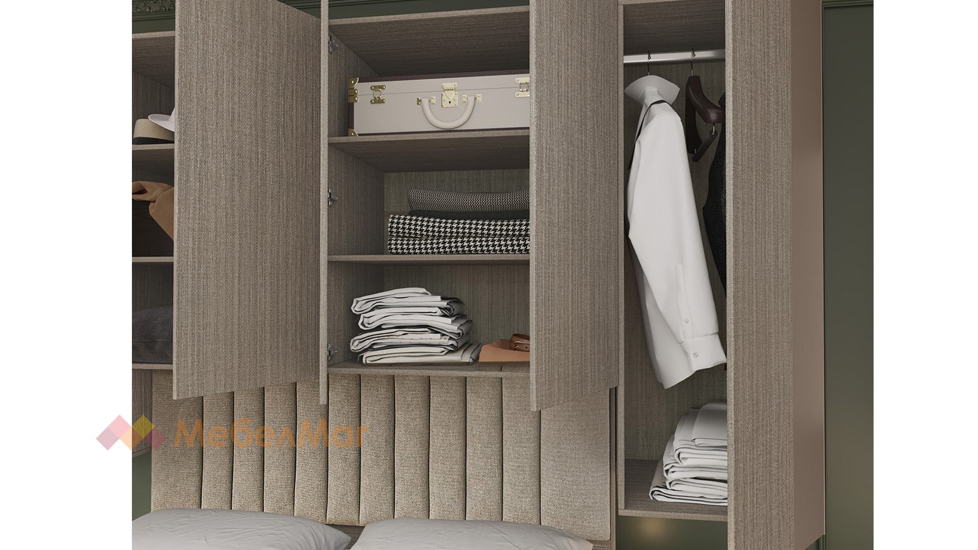 Гардеробът е проектиран така, че да се използва пространството над леглото, предоставяйки максимално удобство и лесен достъп до съхраняваните вещи. С него ще разполагаш с две просторни отделения с лостове, в които можеш да закачиш тоалетите си на закачалки. Сгънатите дрехи, кутии за съхранение или други аксесоари ще намерят място в двете отделения с рафтове.